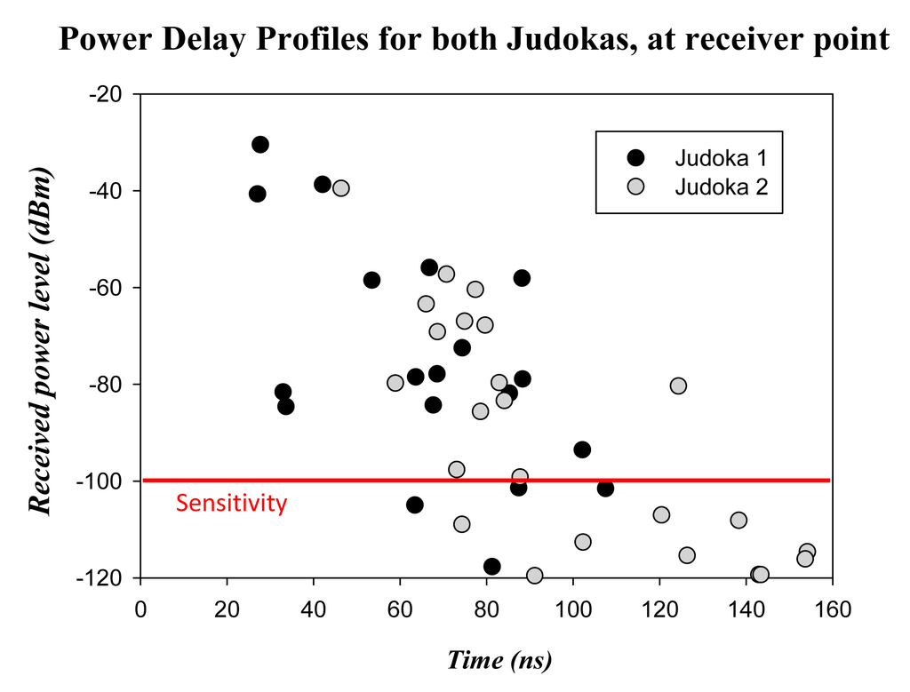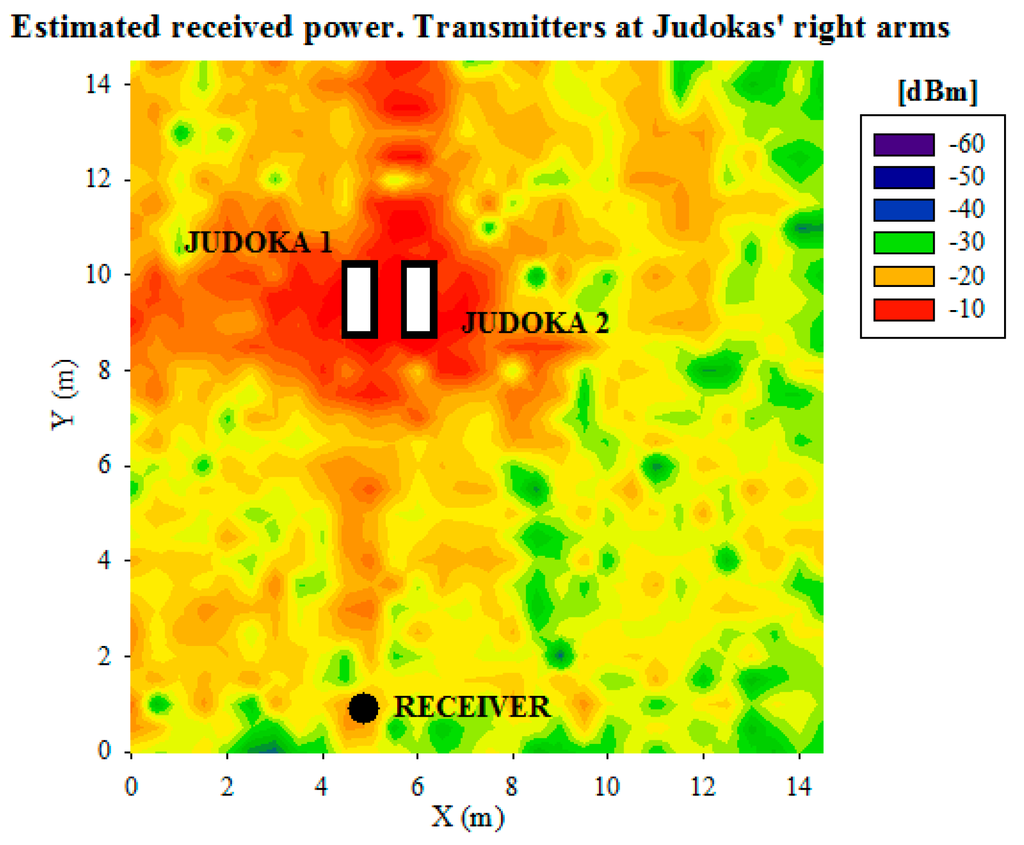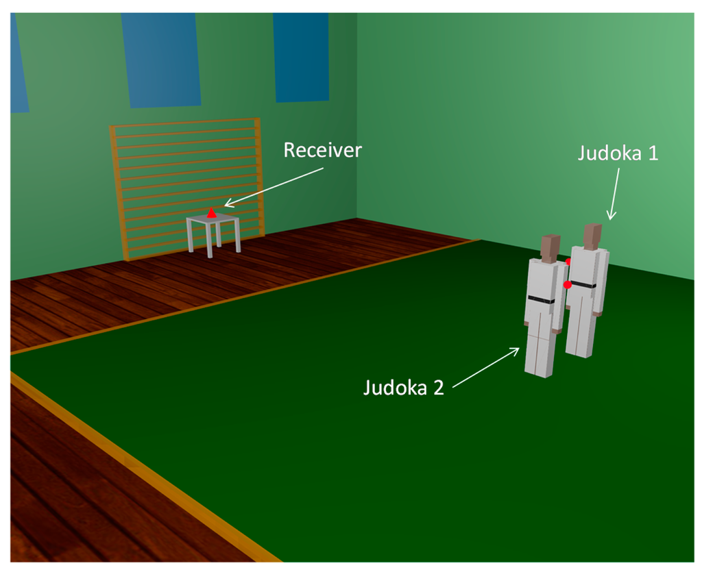 Judo is one of the most popular martial arts practiced around the world. Originally developed in Japan in the late 19th century by Jigoro Kano, the practice of Judo has become popular worldwide. Judo became an Olympic sport in the 1964 Tokyo games, with active worldwide competitions being held under the auspices of the International Judo Federation (IJF), which is subdivided in five different Judo Federations around the world. The practice of Judo has been widely adopted, not only at competition level, but also as part of the physical education programs at different school levels. Judo is considered mainly a body contact sport, in which two different modalities are developed. On one hand, the technical part also known as kata, in which different techniques and movements are evaluated and on the other hand, the combat modality, called randori. In both cases, a key aspect is the postures (with a wide range of different postures and with competition scenarios at a standing level as well as floor level) and the way contact between opponents is produced. In this sense, the IJF provides assistance and guidelines for the organizers of international competitions. Following IJF rules, the environments where judo competitions are held are complex indoor scenarios in terms of radiopropagation, as some competition venues have large spectator capacity, multiple competition areas, furniture, and other facilities. Specifically, for holding international competitions, the competition venue has to have room at least for 10,000 spectators, four or five competition areas, a warming up area with a minimum of 600 m2, and the following services and materials must be provided for each competition area: two electronic scoreboards plus one manual, a table for at least 10 people and a smaller table for the check-in and control of judokas. In addition, a central table for a jury is needed, with a wireless microphone system connected to the public address system for use only by referees, as well as an audio-visual information system to spectators, where the information about the judokas and the results of the combats is shown. Apart from the complexity of the morphology of the environment itself, the deployed wireless systems as wireless microphones, WiFi networks, referees' headphones, wireless systems deployed to be used by the media and the huge quantity of portable personal devices that can be found within a crowded venue can make it a very complex task in terms of interference and coexistence. On the other hand, training venues are usually less complex than competition venues in terms of interferences, as they are smaller, the number of people present is much lower and there are less operating wireless communication systems, but they still have the inherent complexity of indoor scenarios in terms of radiopropagation.