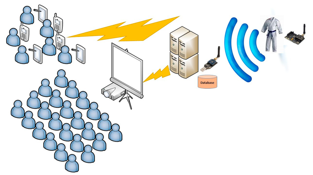 In the proposed application, a ZigBee mote is placed on the judogi. This mote, with the aid of embedded pressure sensors throughout the judogi, sends the amount of pressure (and its location) experimented when the judoka hits the tatami. The communication between pressure sensors and mote is wired, while communication between motes (one for each judoka) and the database wireless (ZigBee). The communication between information displays and portable devices is also wireless. Figure 19 shows schematically the architecture of the information flow from the judogi to visualization devices.