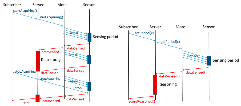 Visualization is a push service since, once initiated, it continuously sends the video signal (or signals, if available) to the client application (mobile application). It is a free access broadcast service to which users can freely subscribe. As opposite, data acquisition and training services are pull services due to the nature of the WSN. Subscribers select the sampling period and motes respond to the demand of the server. Both training and data acquisition services differ on the management of the information collected. The data acquisition service just stores the information collected into a database for a later processing. The training service includes the score inferred by the reasoned and allows the comparison of different stored measures. Figure 20 illustrates the sequential diagram of data transmission corresponding to data acquisition (left) and training services (right), respectively.