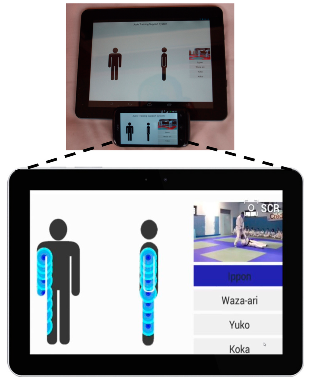 Figure 21 illustrates a tablet and a smartphone running the application, showing the interface provided by the visualization service, where the randori is presented at the top right of the display, while the left side of the display is devoted to represent the body areas that have impacted into the tatami and the intensity of the impact. Note that only sensed parts of the judogi (jacket and trousers) can provide information. The bottom right side of the display is devoted to display the score obtained by the execution of the technique (highlighted in dark blue).