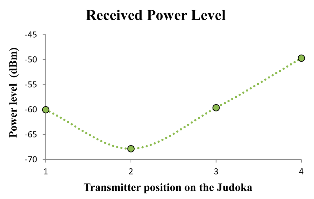 As it is previously stated, the judokas will be involved in the most interesting potential judo applications. Therefore, a second measurement campaign has been carried out with the presence of a judoka. The judoka has been placed in the middle of the tatami, facing the receiver point. Like in the previous measurements, the receiver is placed at the same position and it has not been moved. On the other hand, the XBee Pro transmitter has been placed at different parts of the judoka's body (chest, back, knee and arm), fixed as seen in Figure 4a,b. The motes have been configured as in the previous measurements. It is worth noting that all the measurements have been taken using two different judogis (jacket, trousers and belt) approved by IJF (see Figure 4c), in order to make them as close as possible to a realistic high level judo environment. Figure 5 shows the obtained power level values at the receiver location. As can be seen, the position of the transmitter mote on the body has a big impact in the received power level, which could be given by the fact that the receiver is placed on a table at a different height comparing to the transmitter. Note how a significant attenuation appears when the human body is between the transmitter and the receiver (transmitter on the back).