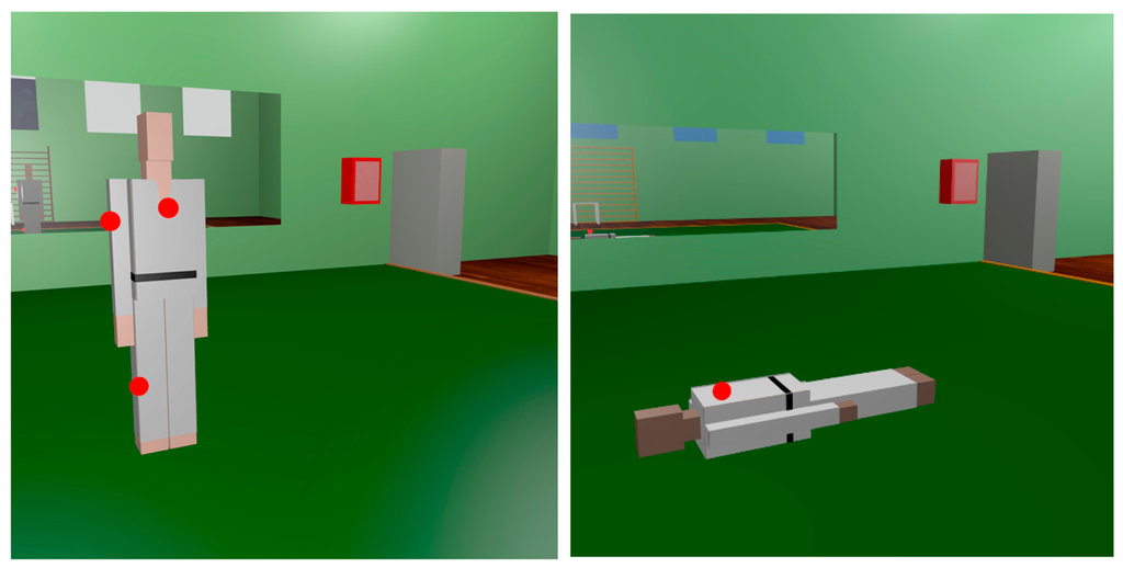 In addition to the radiopropagation measurements shown previously, wireless channel quality measurements have been taken in order to study if the deployed ZigBee-based communication system between a judoka/tatami and the referees' table is indeed feasible. For that purpose, a wireless link has been created between the judoka/tatami and the table with the aid of two XBee Pro modules. On one hand, the transmitter has been placed on different parts of the judoka's body, standing as well as lying in the center of the tatami (as during judo combats there are both standing and ground actions). In Figure 6 the transmitter position configurations on the judoka can be seen, where the red dots represent the XBee Pro modules. On the other hand, the same transmitter positions indicated in Figure 1b have been used for the tatami-to-table measurements. The receiver position is also the same as in the previous measurements (Figure 1b). All the measurements have been carried out with only one transmitter operating at the same time.