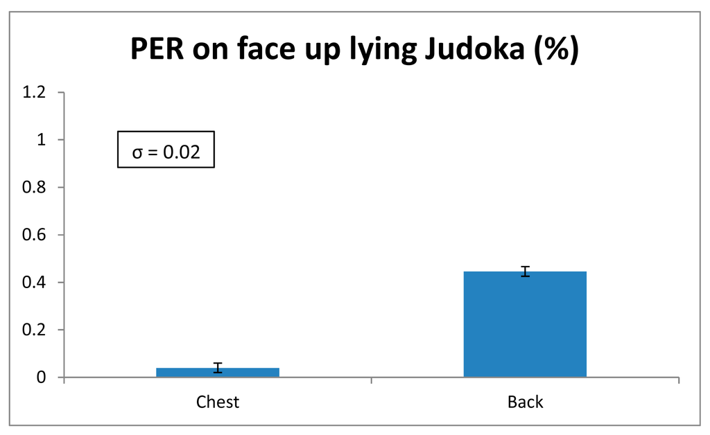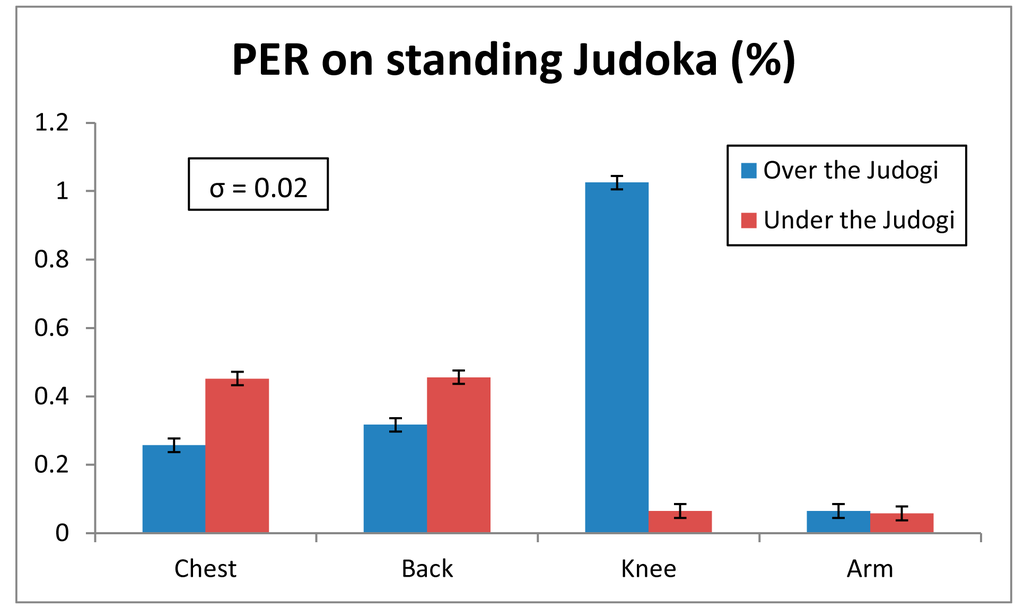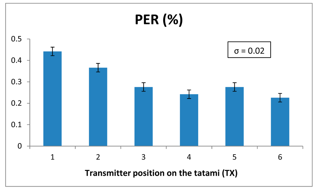 The parameter chosen for the analysis of the wireless channel quality has been the Packet Error Rate (PER), which gives the percentage of the lost packets during the transmission of previously fixed packet value. In this case, 100,000 packets have been transmitted in each PER measurement. The parameters of the XBee motes have been defined like in the previous radiopropagation analysis. The transmission has been done without ACK (Acknowledgment) packets. In Figure 7 the obtained PER values for the tatami-to-table communication links are shown. Although the PER value varies depending on the position of the transmitter, this variation is very small. Besides, all the values are very low, i.e., few packets are lost. The standard deviation for each measurement point is also shown, which is very low, namely 0.02% in terms of PER. This means that the PER variation is strongly dependent with the position of the transmitter. Similar results can be seen for the case with the transmitters placed on the judoka's body. In Figures 8 and 9 measured PER values for standing and lying judoka can be seen respectively. In this case, besides the fact that the PER will change depending on the position, other issues affect the transmission, like the difference transmitter position heights or the polarization of the transmitter antennas, which is the opposite for the standing judoka measurements. For a more in-depth analysis for the motes placed on the judoka, the effect of the judogi in the transmission has been analyzed. Specifically, for the standing Judoka, measurements on and under the judogi for each position have been carried out in order to quantify the PER difference. The results show that it has not great impact and the number of lost packets is still very low (see Figure 8). Finally, it is worth noting how the PER value changes when the judoka is lying face up on the tatami: comparing with the case of the mote on the chest, significantly more packets are lost when the transmitter is on the judoka's back and the body lies over the device (see Figure 9). Even so, the PER values remain low. The obtaining of these low PER values is mainly due to the sensitivity level of the XBee Pro modules, which is lower (−100 dBm) than the received power levels at the receiver position (see Figures 3 and 5 ).