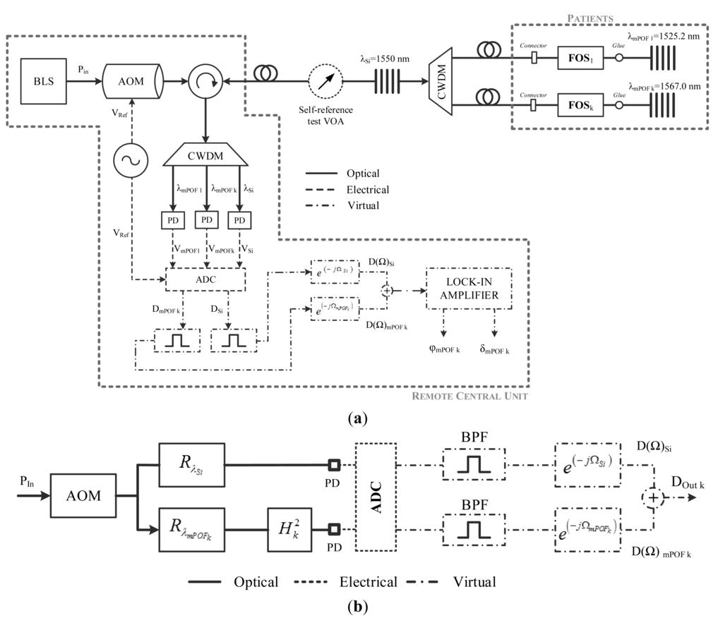 The proposed topology, depicted in Figure 1a, follows the frequency-based self-referencing technique for remotely addresing fiber-optic intensity sensors, as it is one of the most popular strategies for self-referencing schemes in the last decade. The use of resonant structures as basis of a self-referencing intensity type sensor has been widely identified in literature in an approach that is known as amplitude-phase conversion technique. In it, the optical power injected into the system is sine-wave-modulated. In the sensing head, a fraction of that power is not affected by the measurand, constituting a reference signal. The other fraction is intensity-modulated by the measured and constitutes the sensing signal. When both fractions are combined at the reception stage, it gives a resulting optical-power intensity sine wave. The phase of this signal, relative to the phase of the electrical signal that modulates the optical power emitted by the optical source, depends only on the optical loss induced in the sensor head by the measurand, including a constant factor determined by the length of the lead/return fiber. The evaluation of the phase allows information to be obtained about the measurand status; independently of the optical power fluctuations that can occur outside the sensor head thus performing a self-referenced measurement. The improvement of this configuration in comparison with other solutions [24–26] is the combination of silica and polymer FBGs for addressing multiple sensors at the remote points. In order to get a biocompatible system for medical applications, the usage of a single reference silica FBG and an improved remote reconfigurable virtual lock-in amplifier able to detect low signal variations provide extra features allowing the sensor interrogation.