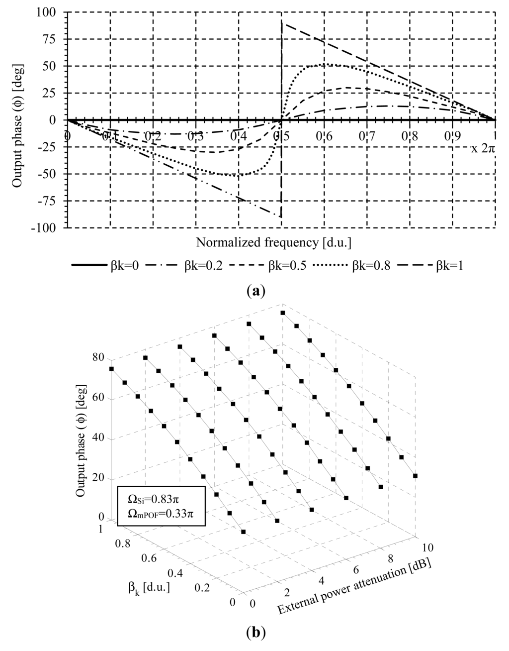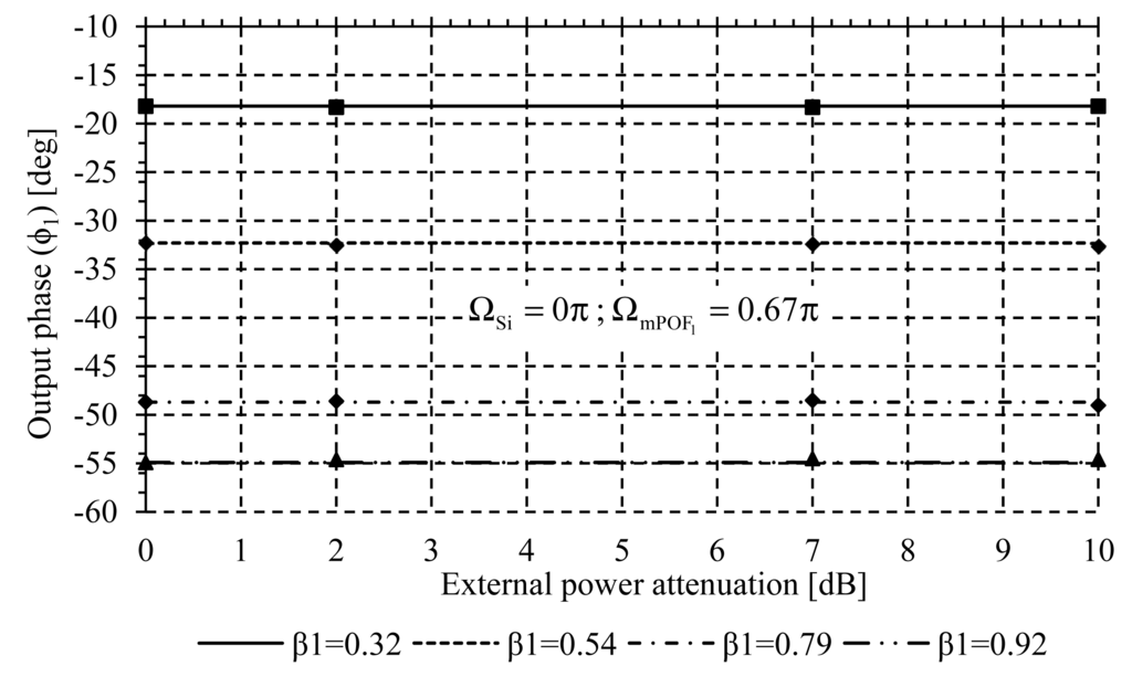 The parameter Φk is insensitive to power fluctuations except for the sensor modulation (Hk), thus aproviding a self-referenced measurement approach. A specific example of Φk versus the sensor losses βk for different external power attenuations is shown in Figure 2b. ΩSi = 0.83π and ΩmPOF = 0.33π are the reference and sensor phase-shifts signals, respectively.