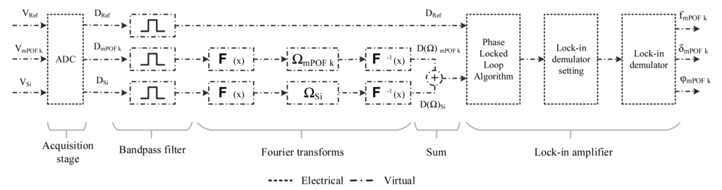 Finally, a lock-in amplifier based on a graphical code [27,28] was used to obtain frequency, phase and amplitude of the added signal. The lock-in amplifier consists of three functions. The first function is a phase locked loop algorithm whose function is to measure the frequency and phase of the lock-in reference signal. The second function is used to internally calculate settings for the mixer and the low-pass filter in the demodulator function. Then a lock-in demodulator function extracts the frequency component from the added signal that uses the lock-in reference signal to specify the frequency and phase. In order to calculate the self-referencing parameter Φk one lock-in amplifier is necessary.