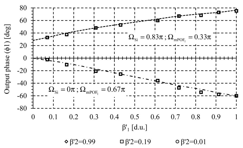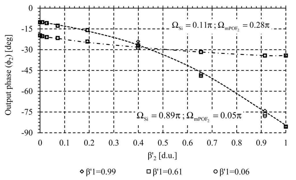 Crosstalk analysis was carried out to measure the possible interference between adjacent channels during the measuring process. Several measurements of the self-referencing parameter Φ1(FOS1) at wavelength λmPOF 1 were taken for different values of the sensor loss modulation β2(FOS2) at wavelength λmPOF 2. Both virtual delays, ΩSi and ΩmPOF k are selected to achieve positive and negative incremental system response, with high linearity and sensitivity. Experimental result is shown in Figure 7. Similar results were obtained when monitoring Φ2 (FOS2) at wavelength λmPOF 2 when sensor loss β1 was changed, see Figure 8. In both cases no crosstalk was noticed, so both sensors can be interrogated simultaneously without mutual interference because of the high channel isolation of the CWDM demultiplexer.
