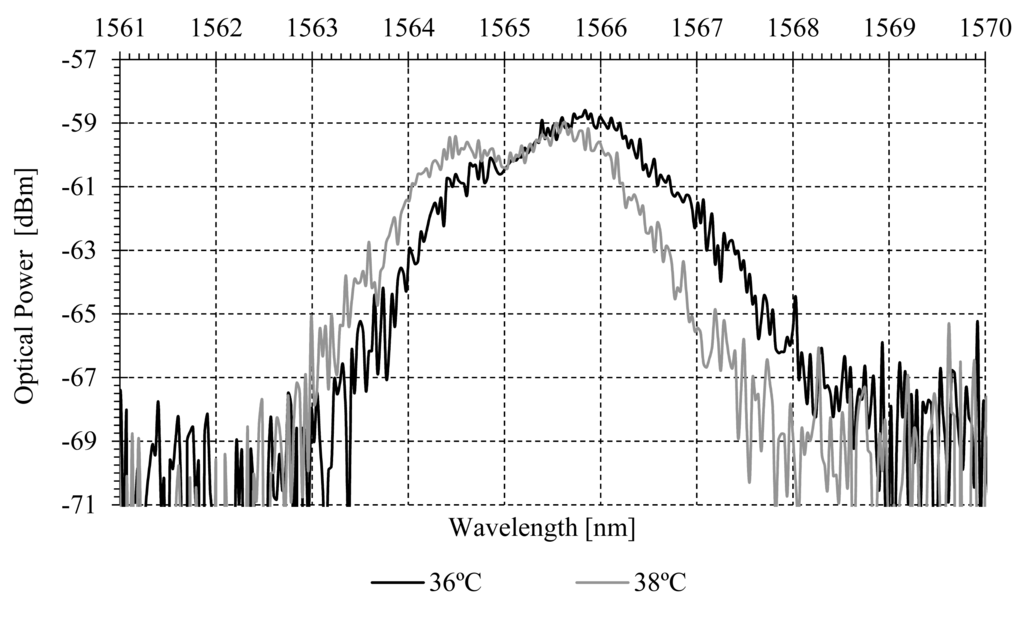 By additionally monitoring each central mPOFBG wavelength shift within the range of each CWDM channel, temperature can be measured, apart from the parameter under test. Temperature characterization of one sensing point can be seen in Figure 9.