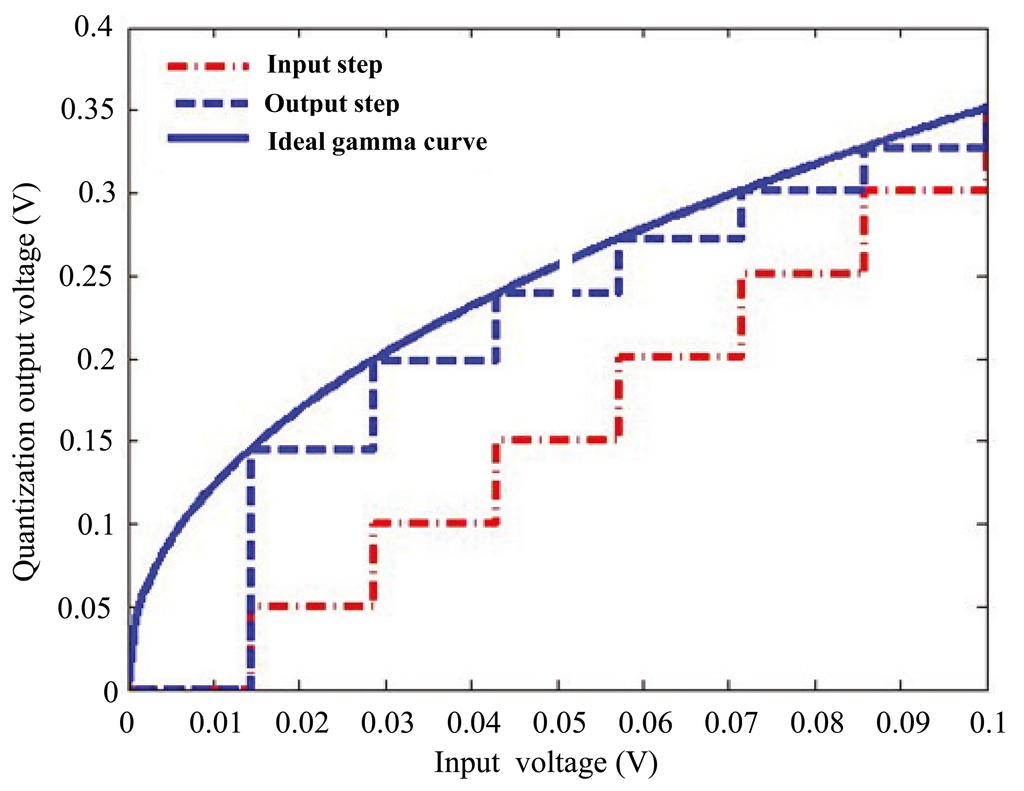 Gamma correction is traditionally conducted in digital domain. Direct lookup tables are typically exploited to realize the digital gamma correction [11]. However, the resolution and dynamic range of the analog-to-digital converter (ADC) are always limited, which largely degrades the image quality, especially with low light illumination. Specifically, in the low light region, the slope of the gamma correction curve is larger than 1, leading to an amplification of the ADC's quantization error [12]. Moreover, as shown in Figure 1, when the input's quantization step is smaller than that of the output, the system is disabled to generate the low luminance levels at the output [12]. Although this issue can be addressed with higher resolution ADC, it can result in an exponential increase of storage amount dedicated to the direct lookup tables. Furthermore, for the high dynamic range applications, the requirements on input resolution and memory resources become much more stringent [12]. Based on non-linear single slope ADC, two analog gamma correction schemes have been reported to avoid the amplification of the quantization error [13,14]. Nevertheless, in [13], the whole dynamic range is not fully utilized. The implementation reported in [14] suffers from the design complexity of a non-linear ramp generator. What is more, in [14], as the gamma value is not constant in the whole dynamic range, it is quite challenging to extend the reported structure to high dynamic range applications.