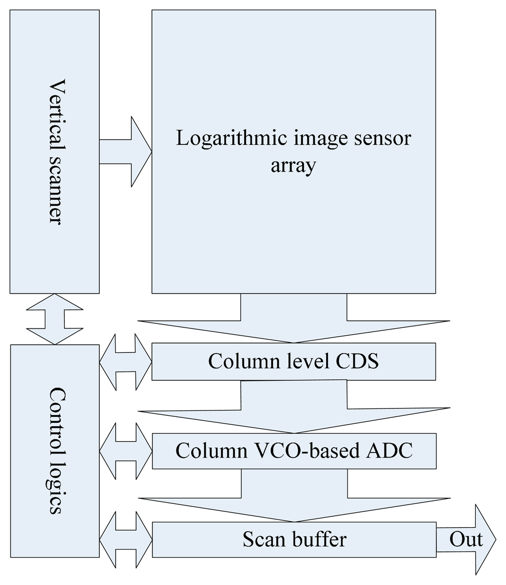 Figure 2 presents the proposed sensor architecture, which is composed of a logarithmic image sensor with on-chip CDS mechanism and a novel VCO-based ADC. It is known that the CMOS logarithmic image sensor features high dynamic range of the illumination light [15]. However, it is quite sensitive to fixed pattern noise (FPN), which is mainly introduced during fabrication due to the pixel-to-pixel parameter variation. In [15], the FPN was modeled by the response of each pixel in terms of offset voltage, gain and leakage current. Based on this, a number of techniques have been proposed to suppress the FPN [15,16]. These techniques share the same principle, that is, the individual pixel offsets can be corrected by extracting the difference between the output signals before and after the integration. However, for the pixel of the logarithmic image sensor, the conversion of light intensity to voltage is continuous. Therefore, a different scheme is needed to remove the offset voltage. In this work, we adopt an in-pixel CDS technique in order to alleviate the influence of FPN. Different from the previously reported on-chip calibration method [17], a current source is employed instead of the leakage current of a transistor for this calibration in order to increase the system's overall speed.
