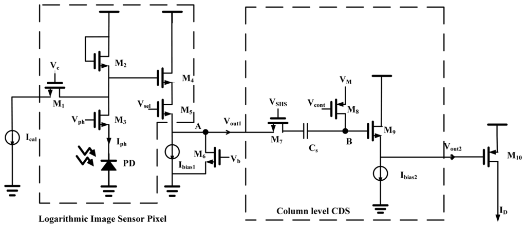 As shown in Figure 3, in the logarithmic image sensor's pixel, we connect the control signals Vc and Vb (denoted as VBody) of each pixel in the same column of the logarithmic image sensor's pixel array, and there are only two current sources Ical and Ibias1 in each column. This column-parallel processing can greatly improve the image sensor's processing speed. In addition, this logarithmic sensor is able to provide two voltage output levels for removing the offset by the following CDS circuit. At the beginning, Vc is set to low and Vph is set to high in the signal readout phase. The pixel output Vsig at node A is expressed as follows [18]: