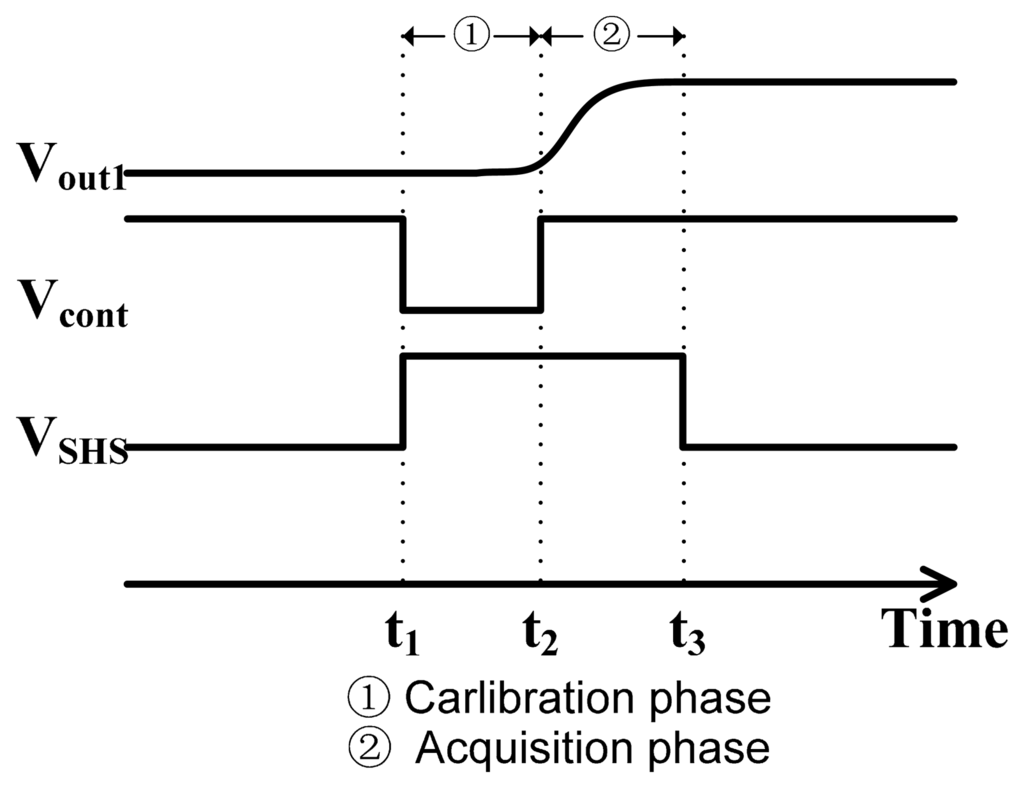 Here CDS technique is exploited to eliminate the FPN by measuring the output of the sensor twice: the first one in reset phase and the second one when the charges are transferred to the read-out node. Successively, these two signals are differentiated at the following stage. Figure 4 illustrates the timing diagram of the CDS. First, node B is connected to an external bias VM (1.5 V) via M8 at t1, and then the calibration voltage Vcal is readout before t2. The sampling capacitor CS stores the voltage of Vcal + Vpix_offset − VM, where Vpix_offset is the total equivalent pixel voltage offset. After node B is floating by turning off M8 at t2, the pixel signal value Vsig + Vpix_offset is then readout at t3, which makes node B voltage VB equivalent to: