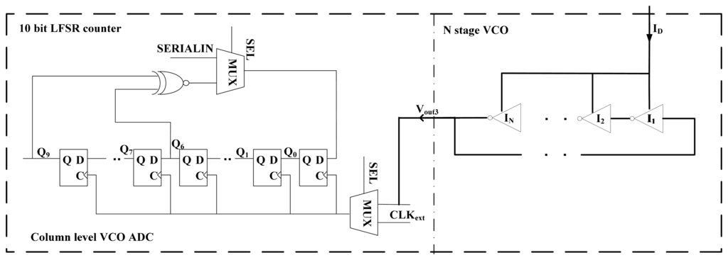 In addition, as shown in Figure 5, a 10-bit linear feedback shift register (LFSR) counter with dynamic D flip-flops is adopted in this design [19]. The input signal SEL is utilized for mode switching. If SEL is high, the counter is in the counting mode. If SEL is low, the pixel is in the data readout mode. CLKext is the clock signal in the data readout mode, and SERIALIN is the data input port to reset the counter. It is noted that the output of the VCO cannot achieve full swing and a voltage level shifter is required. Here we embed a fast and low power consumption voltage level shifter to the MUX for the clock input of the counter [20]. In order to remove the column level FPN, we firstly measured the data D in LFSR when there is no light illuminated on the sensor. The data D represents the column level FPN. We initialized the LFSR with the complementary value of data D at the beginning of every AD conversion when SEL for the MUX is set to 0. After that, the LFSR starts to count the pixel output with light illuminated on the sensor when SEL is set to 1. Through this way, the column level FPN can be reduced. The advantages of using the LFSR counter include: (1) the counter design is simple with a regular and compact layout; (2) the complexity of the counter does not increase with the counter length.