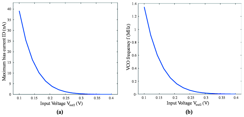 In this section, RF simulations with the Spectre tool of Cadence were conducted based on the standard 0.35 μm CMOS process. Two most important figures of merit (i.e., maximum current ID of the bias transistor M10 and the VCO output frequency f) with different bias voltages are calculated and plotted Figure 6a,b, respectively. The curve in Figure 6 shows excellent agreement with Equation (13). In addition, it is indicated that the frequency output of the VCO has the same logarithmic relationship with the maximum current, which is in accordance with Equation (14).