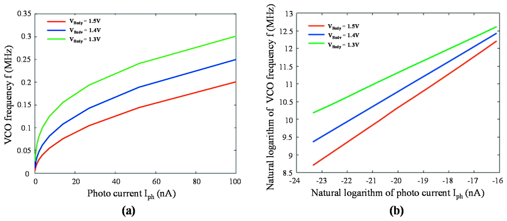 Figure 7a,b present the simulation results of the proposed structure's frequency response f as a function of photocurrent Iph with variable VBody (i.e., Vb) in linear space and logarithmic space, respectively. According to Equation (14), after natural logarithm performed on both sides of the equation, we can have: