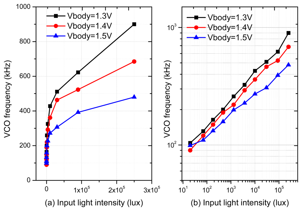 In order to study the relationship between the VCO frequency and the input light intensity, a single pixel with the VCO-based ADC has been fabricated using 0.35 μm standard CMOS process. The VCO consists of 25 inverter stages. The digital 1/1024 frequency divider has been employed to slow down the frequency, as the high frequency signal is extremely hard to be output through the normal I/O pad. With a model 66885 light source from Newport Corp. (Irvine, CA, USA), Figure 8a,b show the measured VCO frequency vs. light intensity for a test pixel in linear space and logarithmic space, respectively. We can see the proposed method can provide an adjustable gamma value over a wide dynamic range. Typically, the measured curve slope of 0.47 corresponds to a gamma value of 2.13 when VBody = 1.4 V.