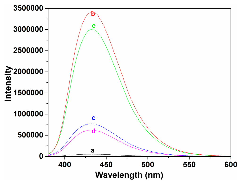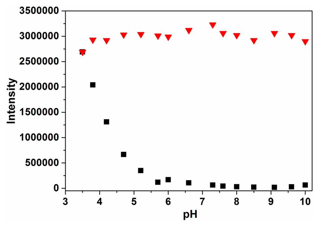 The influence of pH on the fluorescence response of probe P was determined first (Figure 1). At pH below 5.7, the fluorescence response of P was affected by pH to some extent. With the increase of pH from 5.7 and 10.0, “off-on” fluorescence signals at 432 nm were mainly caused by the addition of Cu2+. This indicated that the receptor gradually captured Cu2+ and formed the P-Cu2+ complex. In this work, pH 7.4 was chosen as an optimum experimental condition in that P could work with very low background fluorescence.
