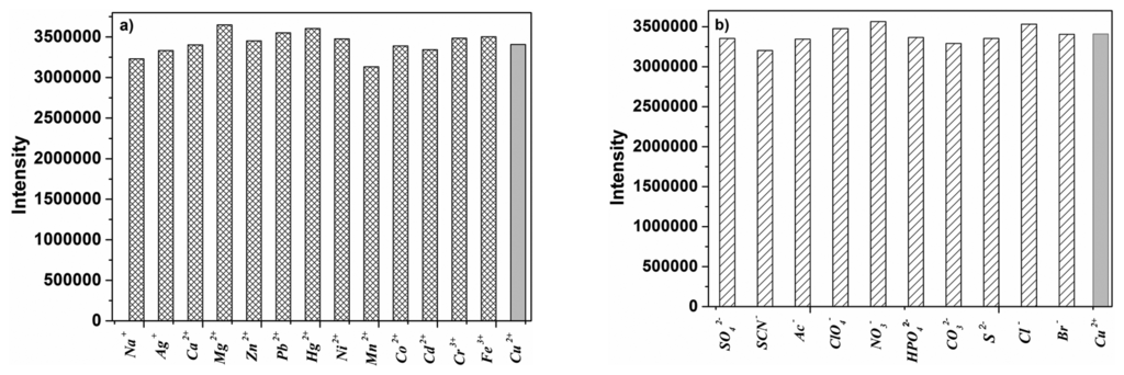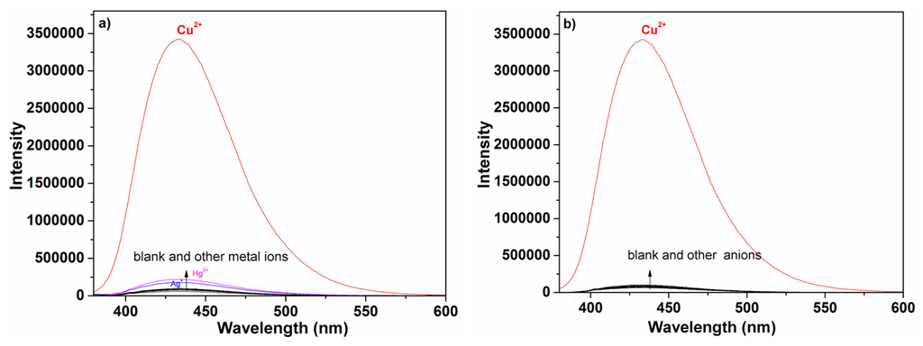 An important feature of P was its selectivity toward Cu2+ over other competitive species, and the selectivity experiments for probe P were conducted as shown in Figure 2. Fluorescence spectral changes of P were examined with addition of metal ions and anions including Na+, K+, Ag+, Mg2+, Ca2+, Zn2+, Pb2+, Cd2+, Co2+, Ni2+, Mn2+, Hg2+, Cu2+, Cr3+, Fe3+, Al3+, S2−, SO42−, SCN−, NO3−, CO32−, Cl−, Ac−, ClO4−, Br− and HPO42−. An obvious enhancement of fluorescence intensity at 432 nm was observed only upon addition of Cu2+, which was attributable to the complexation between P and Cu2+. In contrast, no obvious changes were observed in the case of other metal ions and anions. Moreover, to check the interferences from other metal ions and anions on the fluorescence signal of Cu2+, competition experiments were performed between Cu2+ and selected metal ions and anions (Figure 3). When selected metal ions and anions (50 μM) were added into ethanol-water solution (3:2, v:v, 50 mM HEPES, pH 7.4) of P (2 μM) containing Cu2+ (10 μM), the emission spectra displayed a similar pattern to that with Cu2+ alone. This experiment clearly demonstrated that selected metal ions and anions even in higher concentrations did not interfere the Cu2+ detection, which made it applicable for Cu2+ sensing in the real sample.