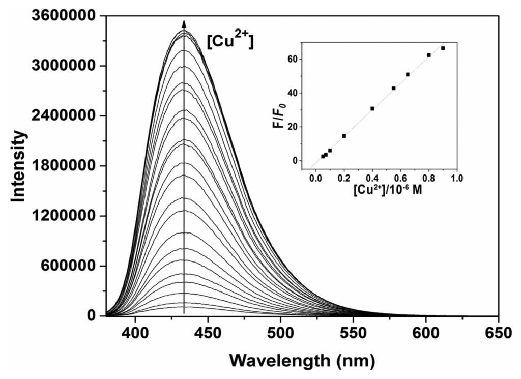 As the Cu2+ concentration increased, the fluorescence emission intensity at 432 nm gradually increased accordingly. The linear fluorescence enhancement of P (2 μM) to Cu2+ was obtained in the range of 0.05–0.9 μM (R = 0.999; inset of Figure 4). The limit of detection (LOD) was 0.03 μM, based on 3 × δblank/k (where δblank is the standard deviation of the blank solution and k is the slope of the calibration plot).