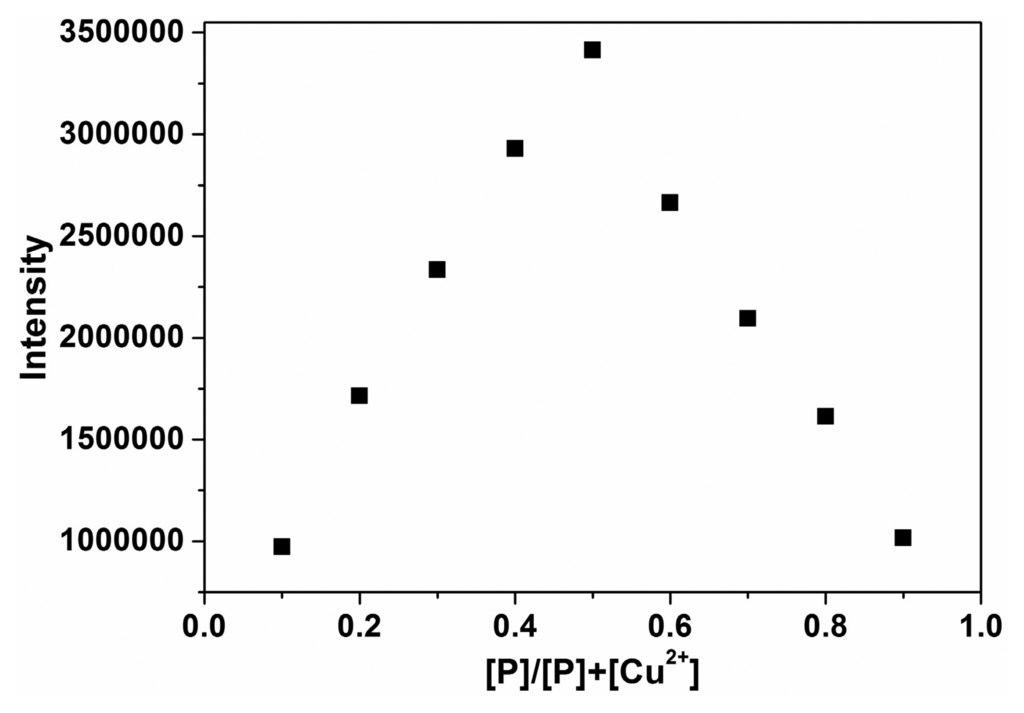 To quantify the complexation ration between P and Cu2+, a Job plot experiment was carried out by keeping the total concentration of P and Cu2+ at 10 μM (Figure 5). The results suggested that a 1:1 complex of P with Cu2+ was formed, which was supported by the presence of a peak at m/z 659.2 corresponding to P-Cu2+ in the ESI-MS spectrum of the components of the mixture of P and 1 equivalent Cu2+ in ethanol (Supplementary Material, Figure S4). The 1H-NMR spectra also indicated the binding of P with Cu2+ (Supplementary Material, Figures S5 and S6). The association constant K was determined from the slope to be 6.2 × 105 M−1, by plotting the fluorescence intensity 1/(F − F0) against 1/[Cu2+].
