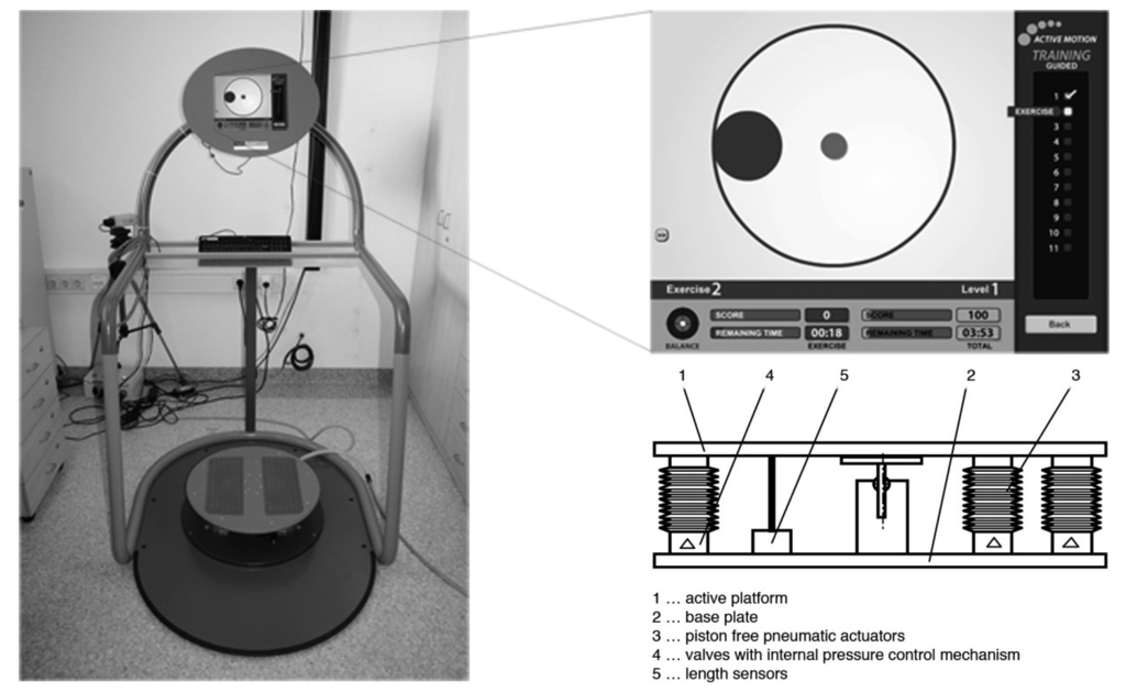 The device (Figure 1) consists of a steel frame, which serves as a security rail for the test person, and functions as a support element for a PC unit, with an integrated 15 in. touch screen. An external control box regulates the power supply and data communication between the action unit and the PC. Standard compressors supply the training device with air (6 bars). The active platform designed by FerRobotics (FerRobotics Compliant Robot Technology GmbH, Linz, Austria) has a diameter of 530 mm. The platform is provided with skid-resistant pads and positional marker. The three piston-free pneumatic actuators (PFPA), are evenly distributed on the circle, set the platform in motion. The PFPA are countervailed by three springs, which are centrally located between the actuators. The PFPA allow for active as well as passive combinations of movements. The movements can be controlled by continuously adjusting the amplitudes and frequencies.