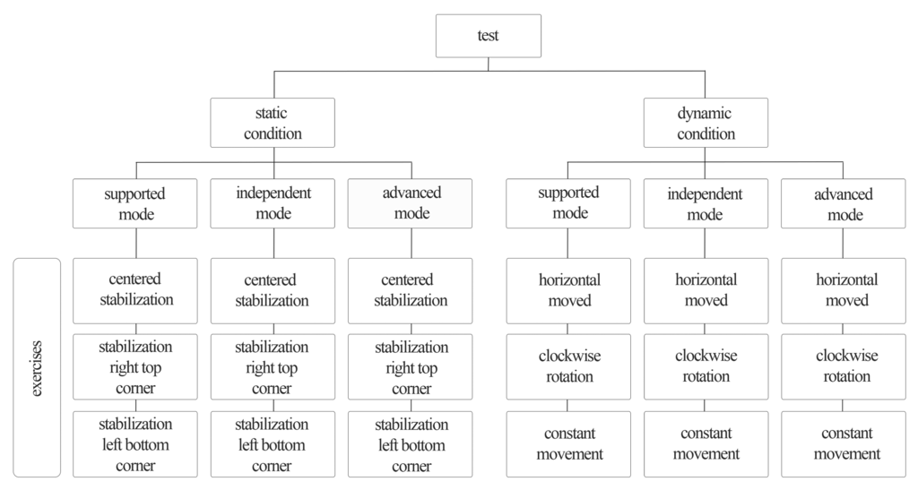 Three different exercises were performed under two test conditions in three different modes: “supported”, “independent”, and “advanced”. The static conditions were as follows: (i) centered stabilization; (ii) stabilization right top corner; and (iii) stabilization left bottom corner. The dynamic conditions were as follows: (i) horizontally moved; (ii) clockwise rotation; and (iii) constant movement (Figure 2). Each exercise lasted 30 s with a 20 s break in between the exercises. The participants took a 1 min break before changing to a different mode. Target size was set at 2.5 times the COP dot, and the target coverage was set at 75%. To assess the reliability of the outcome measurements, a test-retest design was used.