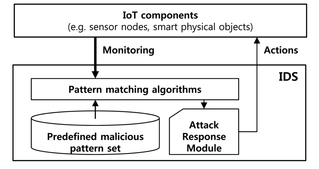 An intrusion detection system (IDS) monitors networks for malicious attacks on inbound and outbound packets by using a misuse detection scheme [7,8]. This scheme uses a pattern-matching algorithm to check predefined pattern sets consisting of intrusion signatures [9]. Each of these signatures is defined in the context of payloads that have previously been revealed as malicious attacks. The IDS inspects the context of the payloads by checking them against the predefined signature set. Therefore, the pattern-matching engine is one of the most important features in network security applications designed to search for malicious patterns. However, it is difficult to operate a conventional pattern-matching engine on smart objects, because most of them are resource constrained in terms of power, processing and memory space [10–12].