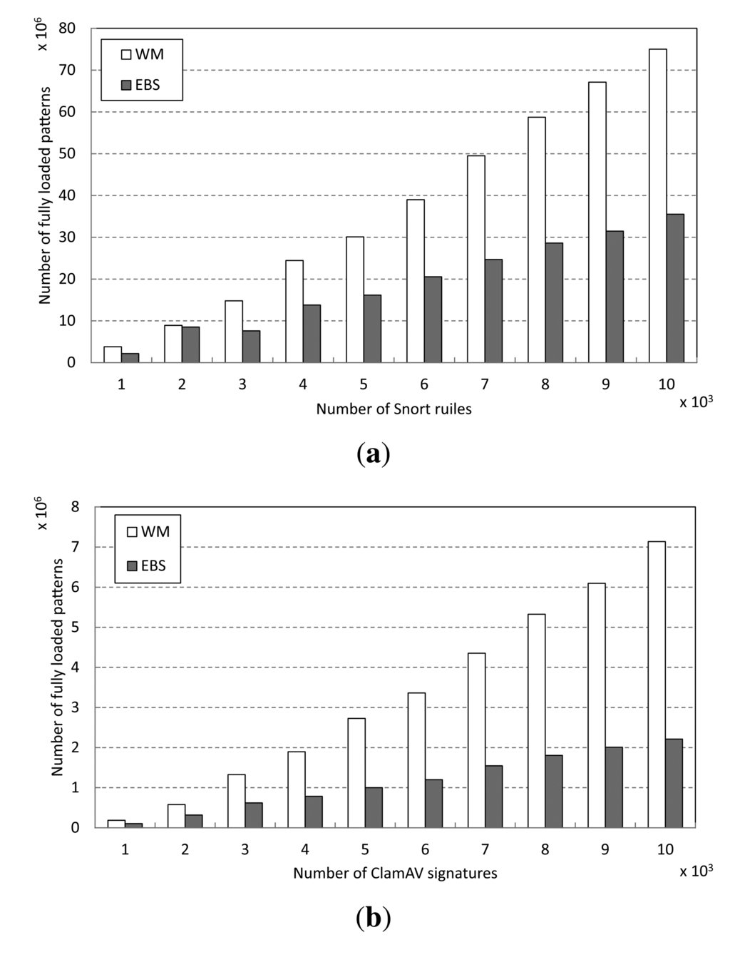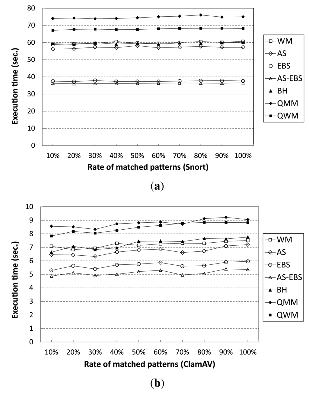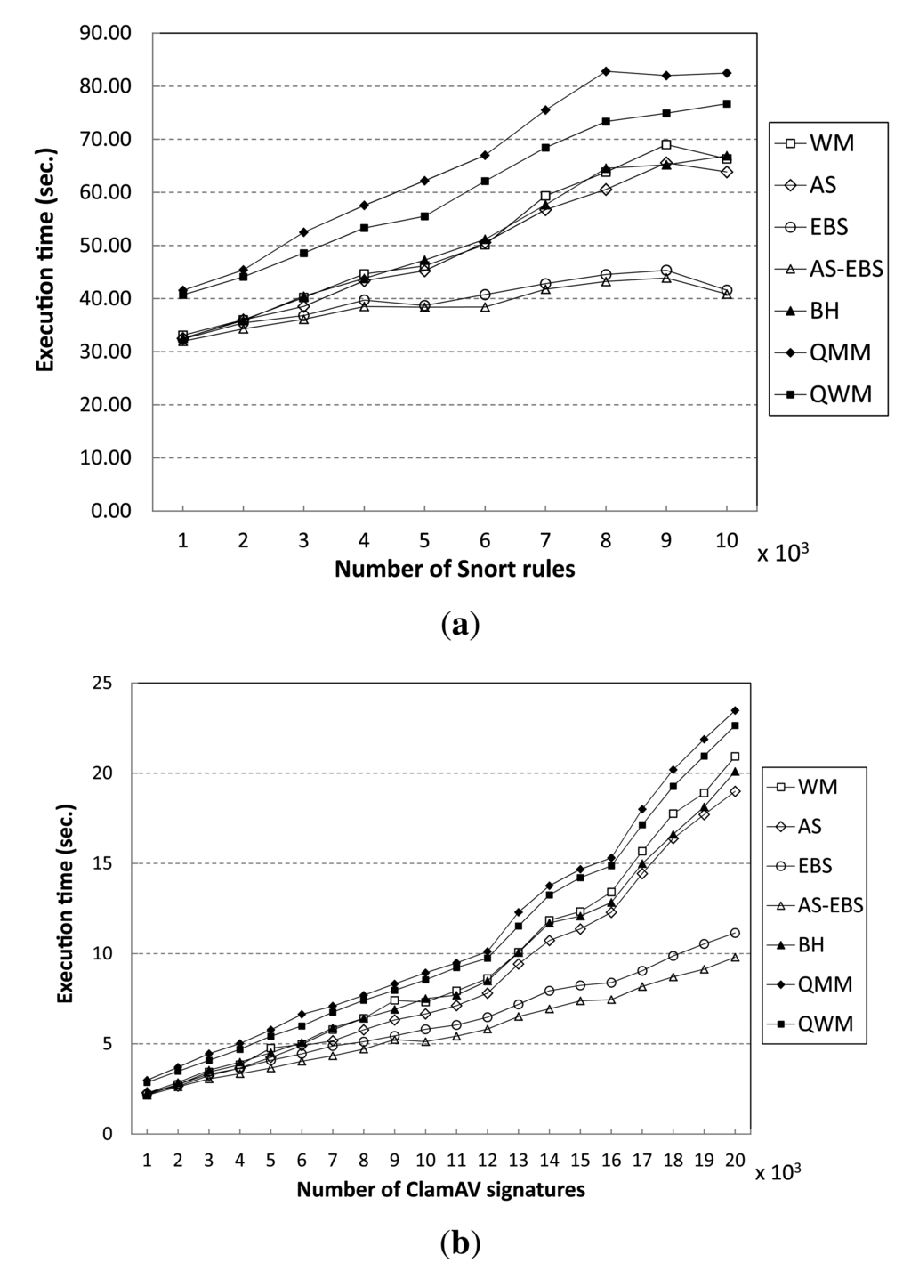 Moreover, the early decision enables us to skip unnecessary matching operations in the prefix table (Step 2) and character matching (Step 3) in WM. AS attains a 4% performance improvement, and EBS records a speed-up of 1.59 compared with WM. For the ClamAV pattern set, AS-EBS again exhibits the best performance: it is almost 2.14-times faster than WM in matching 20,000 signatures, as shown in Figure 9b. AS records a 10% performance gain. Furthermore, EBS attains a speed-up of 1.87 compared to WM.