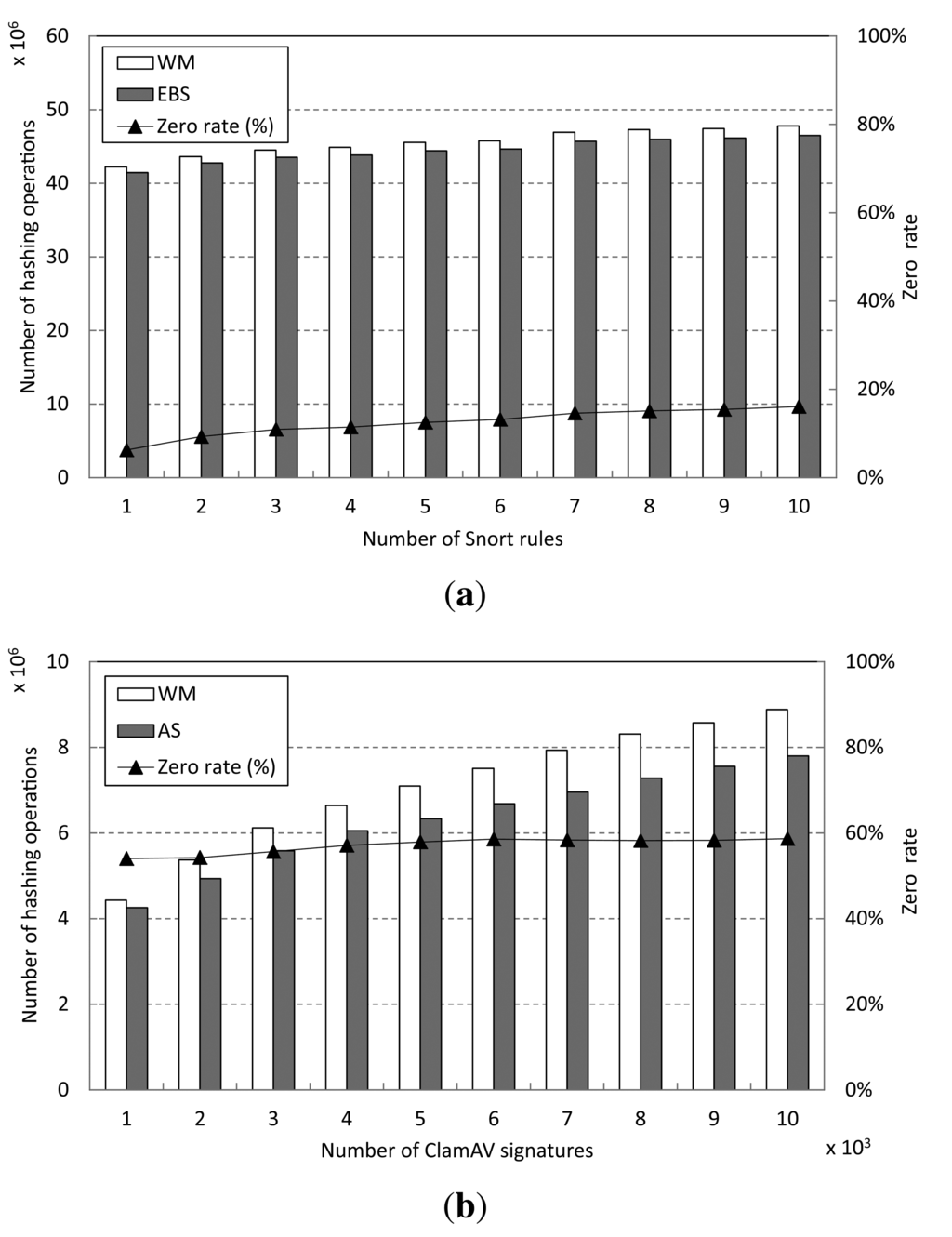 From the figure, we can see that AS has fewer hashing operations than WM. This is because of the larger number of characters that can be skipped in AS than in WM. As the zero rate increases, the number of skipped characters in AS grows. That is, the performance of AS improves in proportion to the zero rate. For the Snort pattern set, AS shows fewer hashing operations than WM, as shown in Figure 11a. On the other hand, a large number of hashing operations can be reduced by AS compared with WM for matching the ClamAV signatures, as shown in Figure 11b. This is because the zero rate for ClamAV is more than 50% and, thus, much higher than that for Snort.