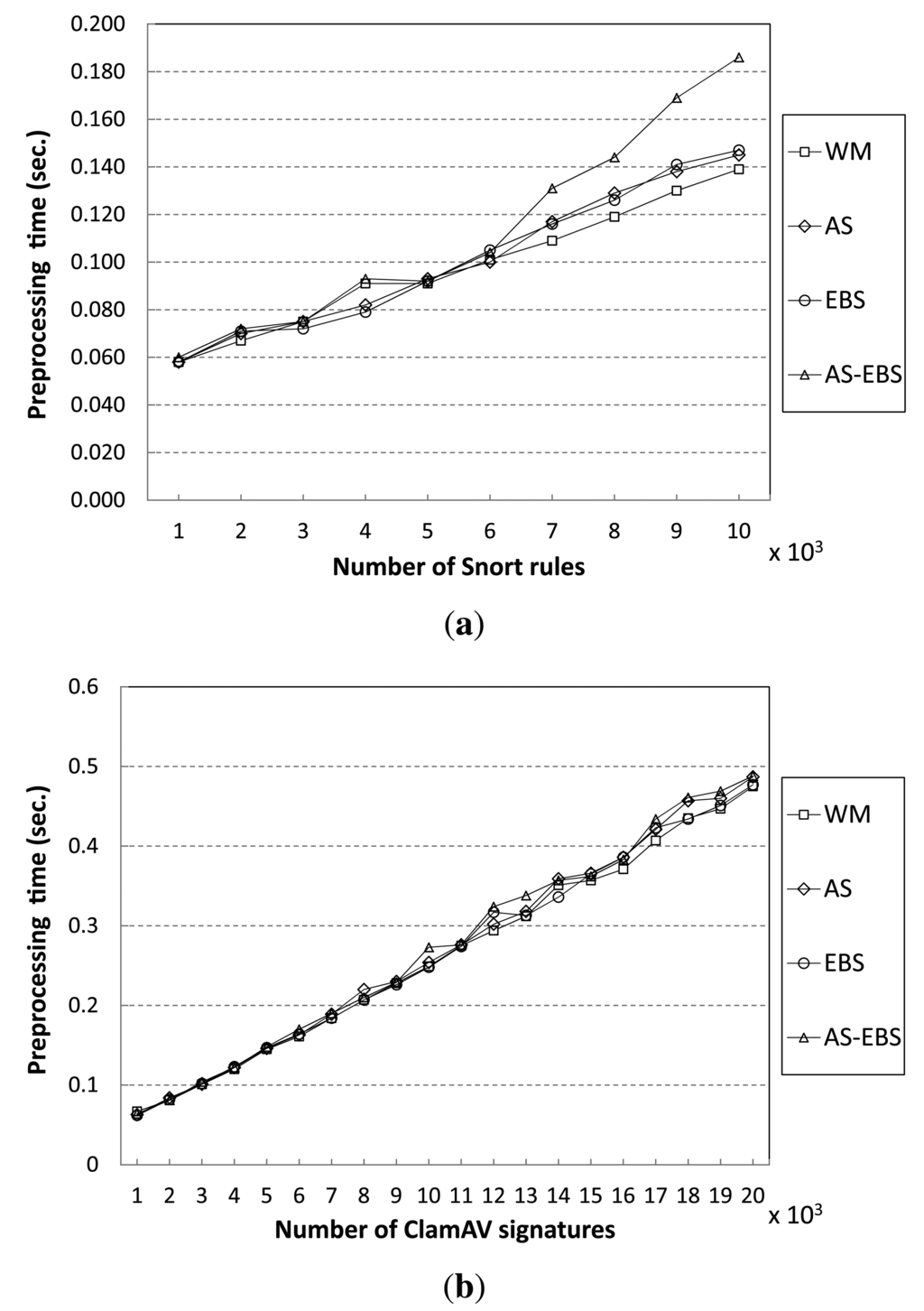 For the ClamAV pattern set, the results are similar to that of Snort. Our approaches do not cause overhead during preprocessing to match fewer than 11,000 patterns. However, AS requires more time than WM to match more than 11,000 patterns. AS spends 5% more preprocessing time than WM to match 18,000 patterns. Furthermore, EBS requires 7% more time than WM. As a result, AS-EBS takes 10% longer than WM to preprocess data.