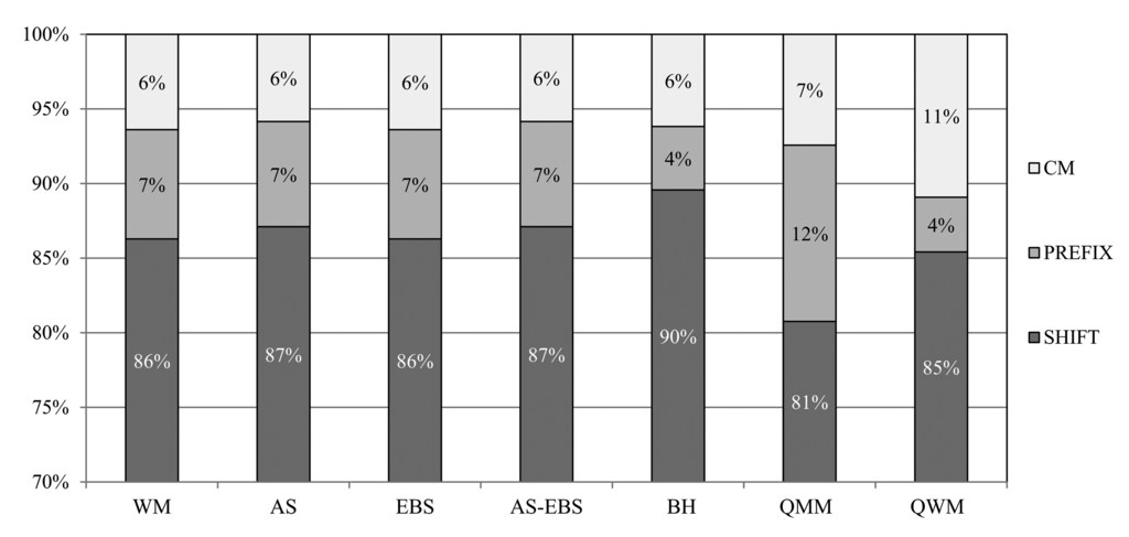 From the results, AS and AS-EBS show 87% accuracy, which is 1% better than that of WM. This is because the auxiliary shifting scheme improves the detection accuracy for SHIFT by eliminating unnecessary shifting operations. However, the best accuracy for SHIFT is achieved by BH as 90%. This is 3% higher than that of AS. BH computes a shift value from twice as many as characters compared to the other methods. Therefore, BH requires more execution time than our approaches, although its detection accuracy for SHIFT is better than AS. Subsequently, the AS and AS-EBS approaches achieve 7% accuracy for PREFIX. This means that the detection accuracy after the prefix matching operation becomes 94%, which is the highest accuracy. Therefore, AS and AS-EBS perform the least number of character matching operations. Finally, all of the algorithms reach 100% accuracy after finishing CM. This is because CM performs exact character matching operations. In the case of EBS, the detection accuracy is equivalent to that of WM. In fact, the early skipping approach mainly targets eliminating unnecessary matching operations without the detection accuracy degradation from WM.