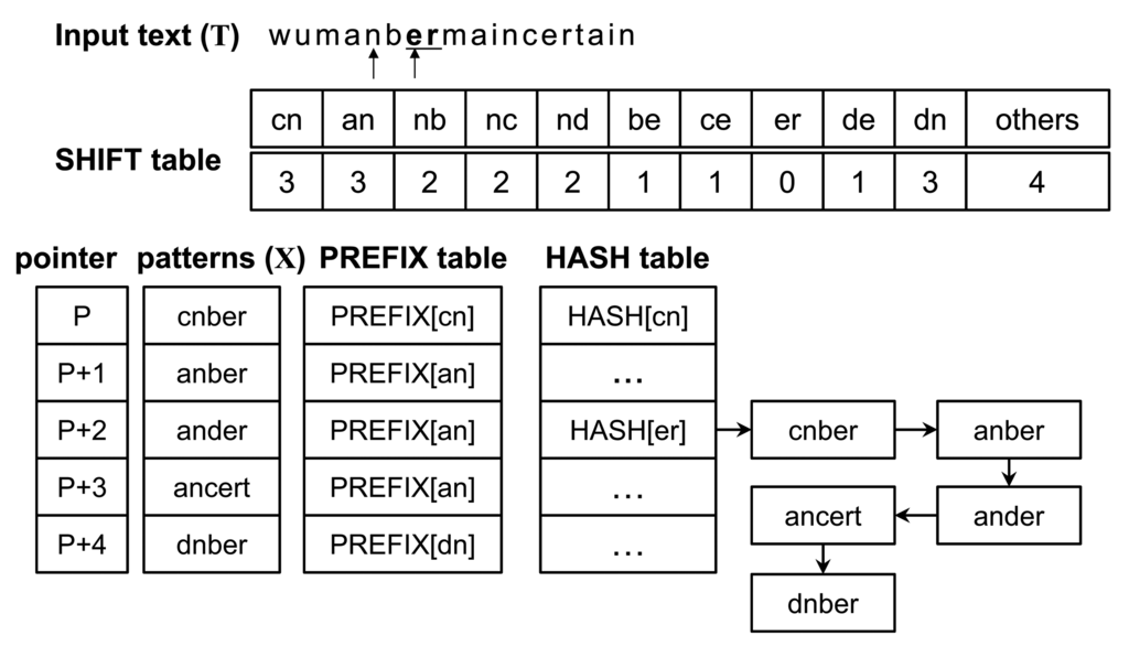 The matching operation is represented through the example shown in Figure 2, and the original Wu–Manber algorithm is described as follows: