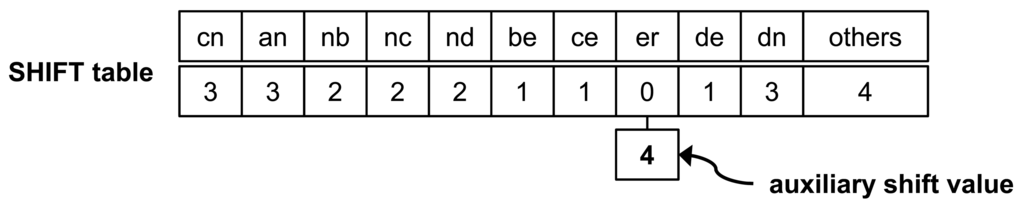 The shift table with AS for a pattern set X in Figure 2 is shown in Figure 3. The only entry having zero shift value is er; SHIFT[er] = 0. Therefore, the er entry has an AS. This AS has the least shift value among the values of SHIFT[er], except for a zero value. For this pattern set, the AS is four.