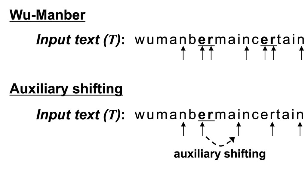 We compare matching procedures in WM and WM with auxiliary shifting in Figure 4. The character sequence of the initial block is “nb” in the input text (T). Both Wu–Manber and auxiliary shifting move the block to the right by two characters, since SHIFT[nb] = 2 in the shift table, as shown in Figure 3. The block then indicates the sequence “er” for which SHIFT[er] = 0. In this case, following the completion of Step 2 for the entry “er,” Wu–Manber shifts by only one character, and the next block has the sequence “rm.” On the other hand, auxiliary shifting shifts the block right by ASHIFT[er] = 4; the next block is “in.” Therefore, auxiliary shifting can skip three characters more than Wu–Manber.