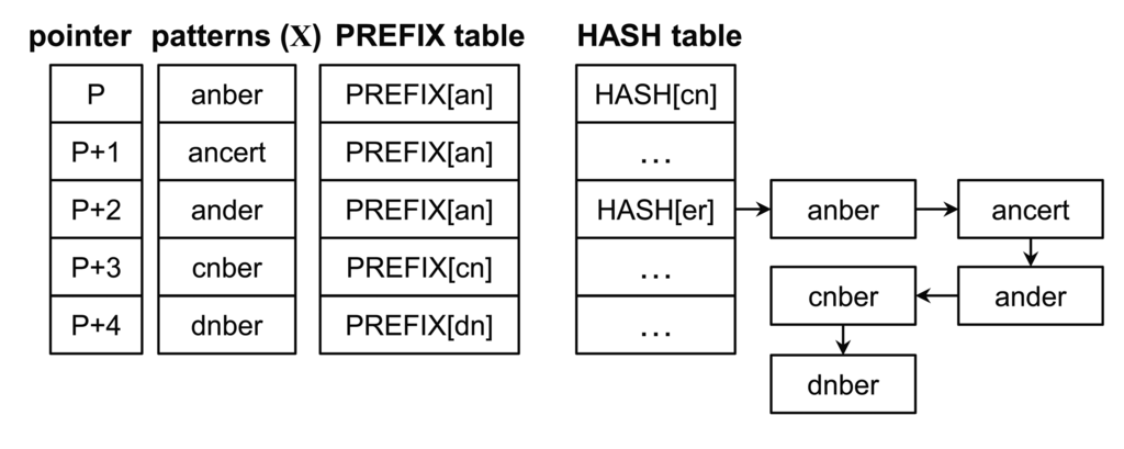 Observation 2: The algorithm is inefficient in that all prefix values in Step 2 and all patterns in Step 3 need to be looked up. Since patterns have been sorted based on their suffix values in the original algorithm, the prefix values need to be compared for all patterns listed in the er index in the hash table. Moreover, all patterns with the prefix an need to be compared to the input data stream in Step 3.