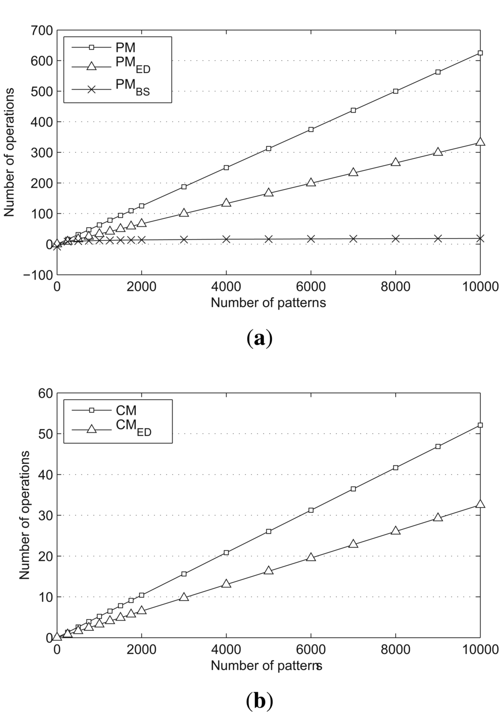 The average number of operations for PM, PMED and PMBS are compared in Figure 6a, and the average number of operations for CM and for CMED are presented in Figure 6b. The size of the scan window and the prefix block are both set to two, and the number of characters is set to four. PMED and CMED reduce the number of required operations by nearly half. Moreover, PMBS shows very stable results, even when the number of patterns increases.