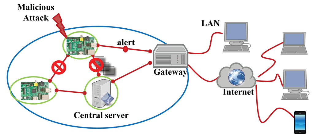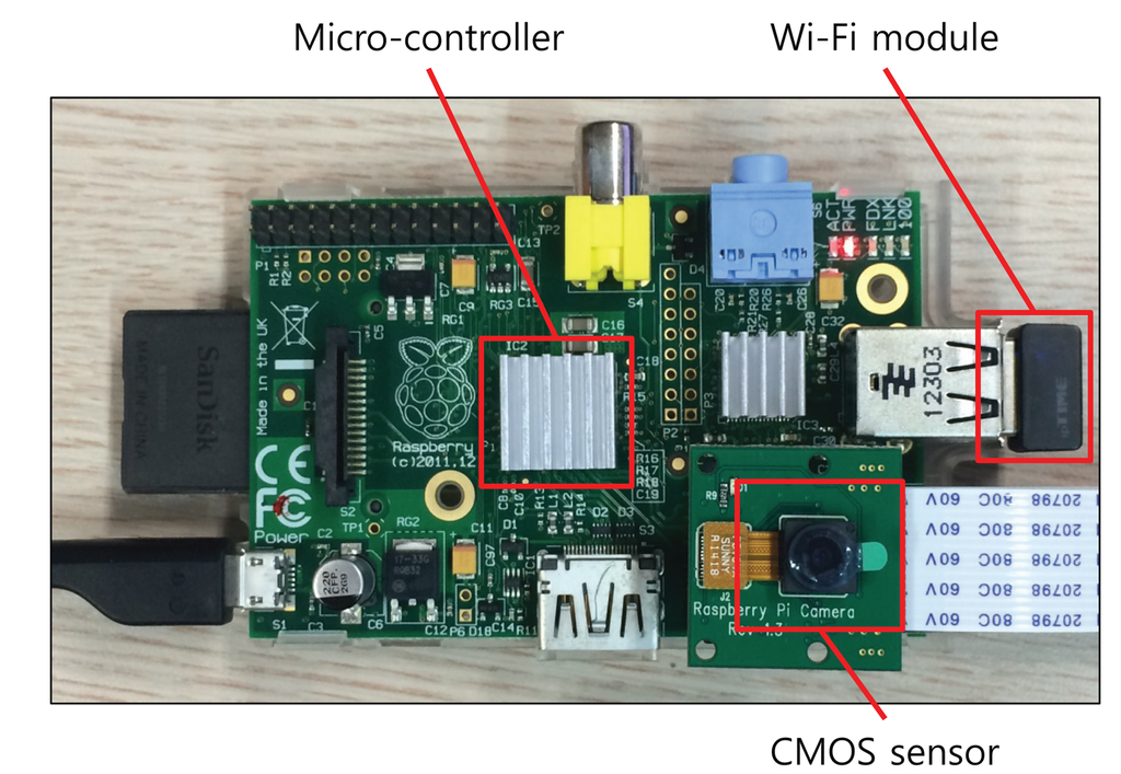 To evaluate the proposed security system for the IoT devices, we exploit a Raspberry Pi [33] computing unit integrating the Omnivision 5647 sensor as the IoT device shown in Figure 7. Many of the IoT systems use Raspberry Pi as the smart devices. The micro-controller of this device consists of an ARM1176 700 MHz processor, 256 MB of synchronous dynamic random-access memory (SDRAM) and 2 GB flash memory. Furthermore, this device is connected to the Internet using Wi-Fi. The main goal of this device is to capture 10 images of 640 × 480 pixels per second by the embedded sensor in a fixed focus module and to transmit these images to the central server. Our malicious detection system concurrently runs on the device during processing its main work streaming the captured images. If the system detects a malicious attack, it stops processing and communicating with the server and alerts the gateway, as shown in Figure 8.