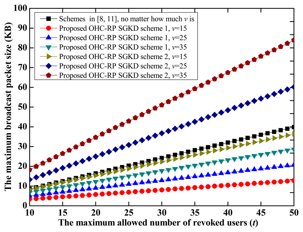 Suppose that during j sessions, the group member addition operation occurs v times. The size of the j-th key updating broadcast packet, Bj, in the proposed OHC&RP-SGKD scheme 1 and Dutta et al.'s scheme is [(t + 1)v + j)]log2q bits and [(t + 1)j]log2q bits, respectively. When v < j, the size of Bj in the proposed OHC&RP-SGKD scheme 1 is smaller than that of Dutta et al.'s scheme.