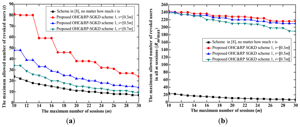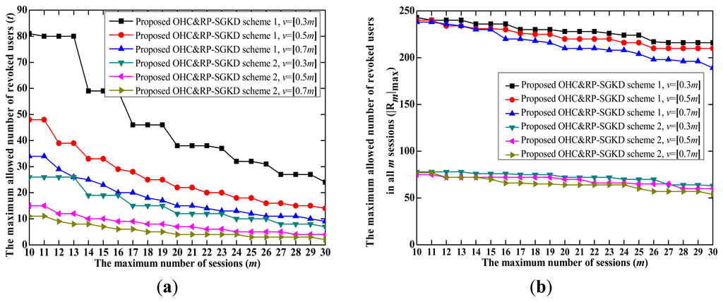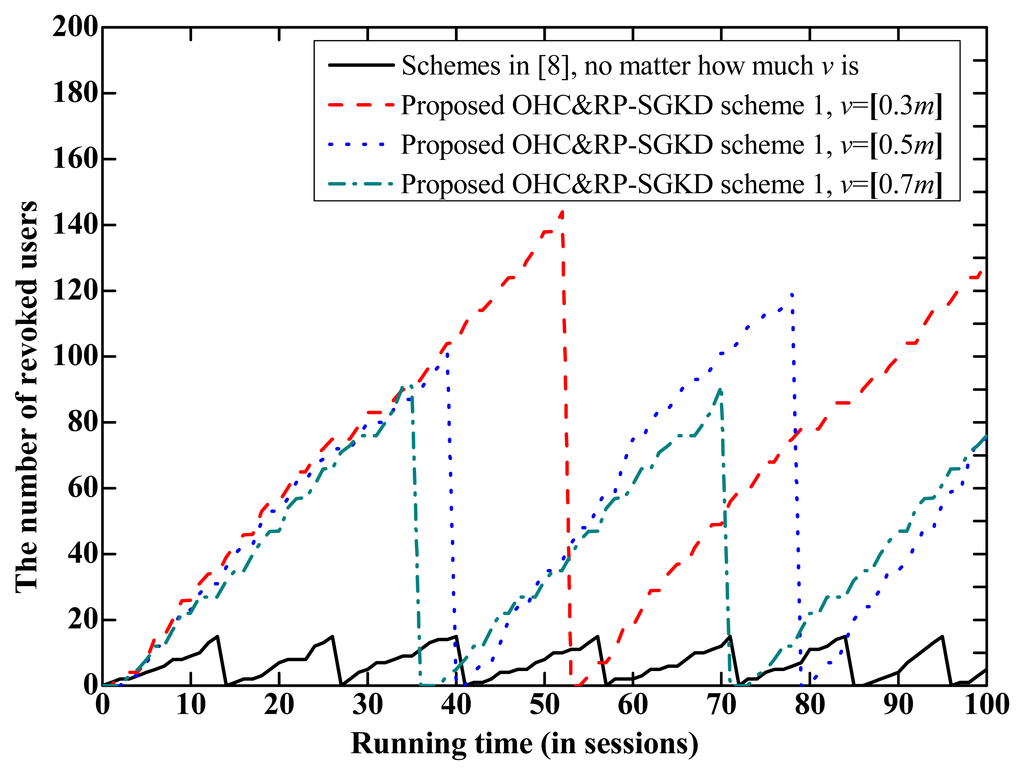 where, m(2) and t(2) denote the session number and the number of revoked users when the proposed OHC&RP-SGKD scheme 2 is reset, respectively.According to the results of Figure 4, when v = 0.5 m, m(1) = 22, t(1) = 20, m(2) = 14, t(2) = 10. Hence, after running 154 sessions, the proposed OHC&RP-SGKD scheme 1 is reset seven times and the proposed OHC&RP-SGKD scheme 2 is reset 11 times. Hence, during the 154 sessions, the decrement of the total communication overhead for updating session keys and the personal secrets in the proposed OHC&RP-SGKD schemes 1 and 2 is ΔE = E(1) − E(2) = 232.72 KB when n = 100.