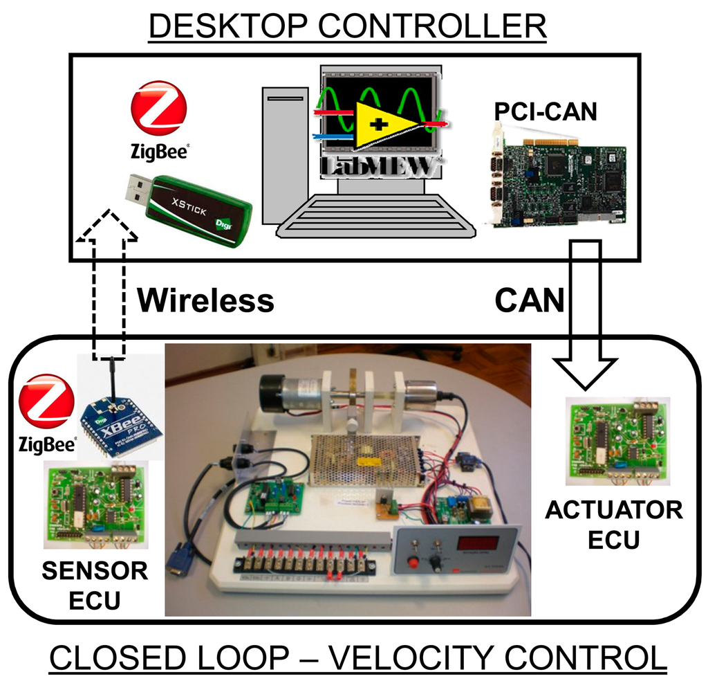 The defined motor velocity control system has one microcontroller based electronic control unit (ECU) responsible for the sensor data acquisition and transmission of the information in the ZigBee network (using an XBee module from Digi International, Minnetonka, MN, USA) and also responsible for the actuation in the plant and communication with the CAN-based network. A desktop with LabVIEW, a PCI-CAN interface and XStick USB ZigBee device were used for the multi-rate PID control and soft sensor strategy implementation.
