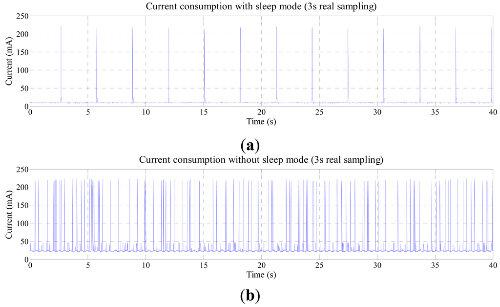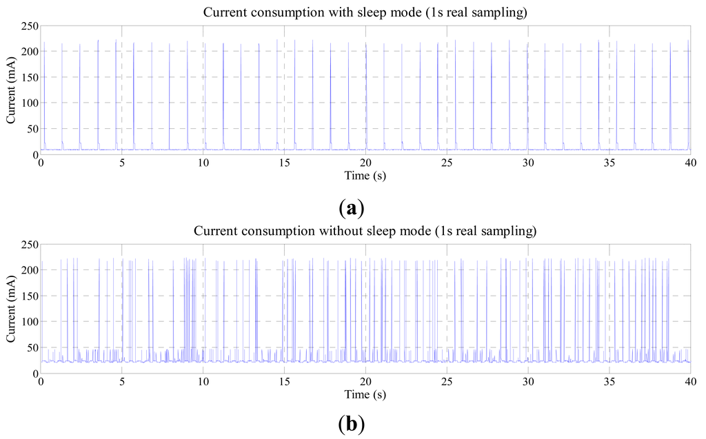 Figure 9 shows the current consumption during operation with 1 s real sampling. Comparing the graphics, when sleep mode is not used, the average current consumption is higher than when using it, and there are more current peaks.