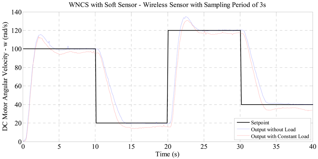 As the soft sensor technique is based on the process mathematical model and there is no correction or adaptation on the model if the process is under any disturbance, an impact on the WNCS control performance operating with disturbances could be expected. In order to verify that, the performance of the soft sensor technique was compared against an experiment with the motor running with a load, simulating a disturbance. This load is added using a mechanical device that increase the friction between the motor shaft and a screw. The results of this comparison can be seen in Figure 11.