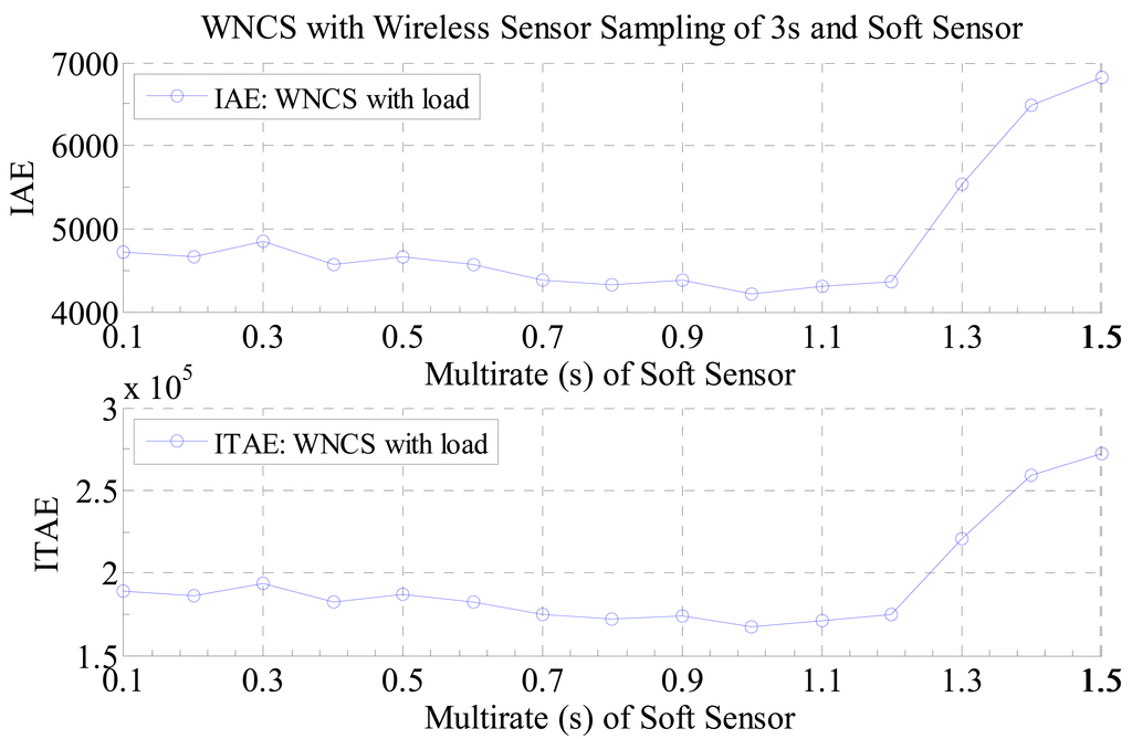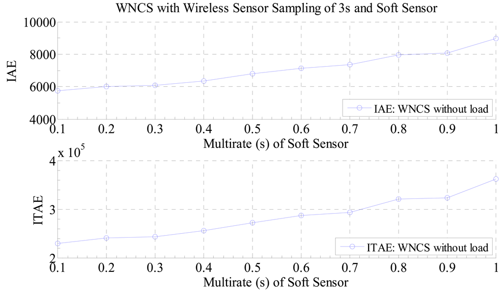 Nevertheless, if a WNCS with disturbance is considered, the conclusion is different. The curve for the WNCS with disturbance, presented in Figure 13, is different from a straight line and the point of minimum value for the performance index is not achieved for the smallest multi-rate sampling period. As the WNCS is operating with disturbance, the virtual data generated by the soft sensor starts does not fit the real data from the process or it starts to be unreliable. As a consequence, if the multi-rate controller uses all that virtual data to control the WNCS, the control performance is deteriorated. As can be seen in the curve of Figure 13, there is a specific point around the value of 1 s for the multi-rate that provides the best control performance achievable for the WNCS operating under disturbance (load), so using the proposed graph it was possible to obtain the best multi-rate sampling period of the soft sensor that provided the best control performance for the WNCS operating with the soft sensor for saving battery lifetime.