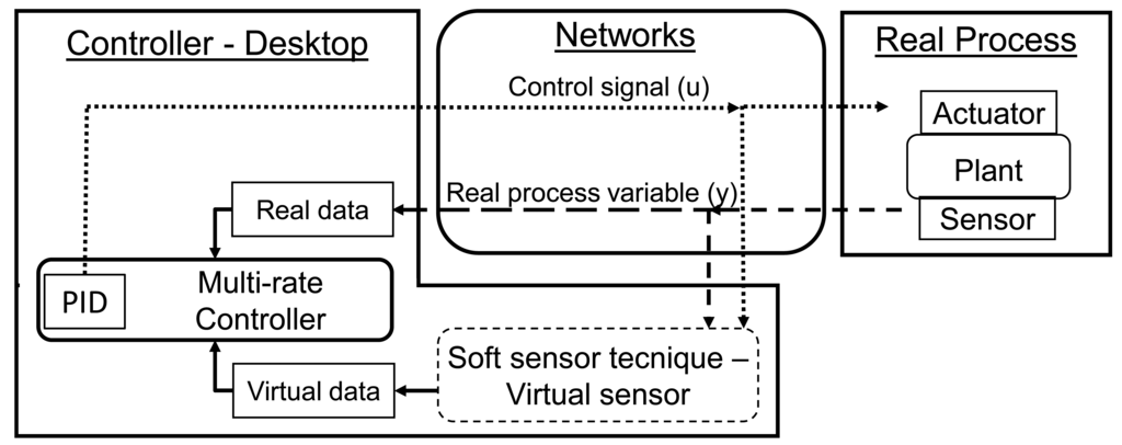 Soft sensor techniques allow estimating the plant behavior through real data and appropriate algorithms, providing additional virtual data to the real capacity of the sensor [33]. Thus, when there is no information from the real sensor, the soft sensor is responsible for generating and providing data to the controller, so that effects of lack of adequate information are minimized. This strategy, wherein the controller execution rate is N times greater than the real sensor sampling period is called multi-rate [34]. [35,36] present results of two different control strategies based on multi-rate PID controllers in which the data supplied was twice that of the real sample, i.e., a dual-rate technic. The controller rate is changed according to the NCS time varying delays in [35]. The utilization rate of an Ethernet network used in the NCS is used to modify the controller execution in [36]. Both papers show that using multi-rate controllers is possible to obtain better performance for the NCS compared with conventional (single-rate) systems.