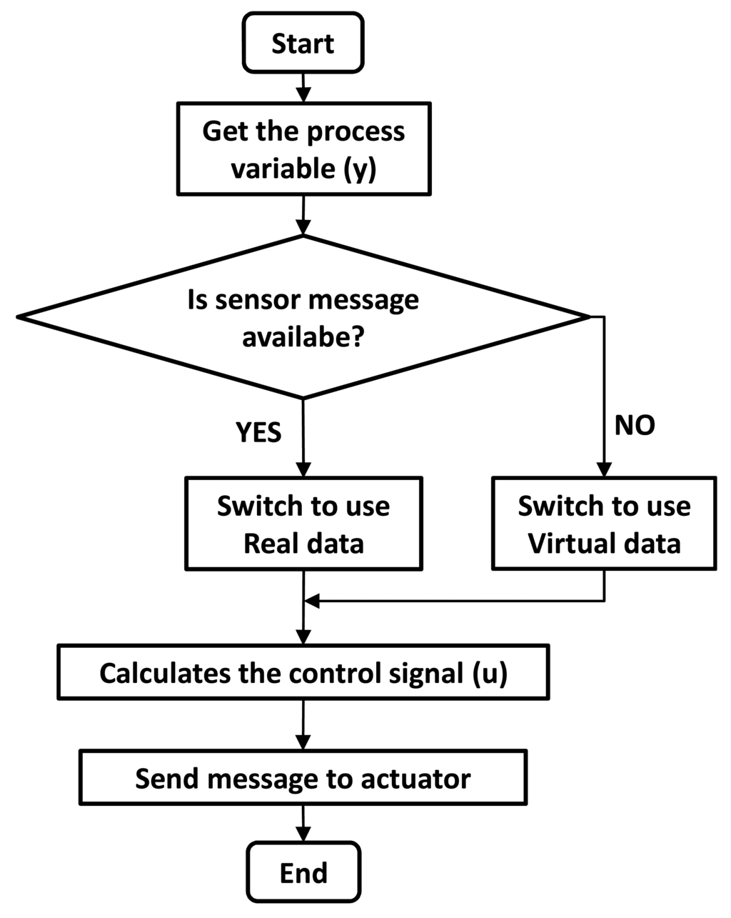 The principle of operation of the soft sensor strategy is detailed in the flowchart shown in Figure 3. Analyzing the flowchart, if the sensor message (process variable) is received by the controller, the real data is used to calculate the control signal to be sent to the actuator. When there is no message transmission from the wireless sensor, the controller uses online updated data obtained from the soft sensor running in parallel with the WNCS. As the soft sensor also receives the control signal sent to the real process, the model output is used as the process virtual data. With this virtual data estimated from the soft sensor (virtual process), the controller calculates the control signal to be sent to the actuator, overcoming the lack of messages from the wireless sensor and guaranteeing the determinism of the closed loop control. The multi-rate control strategy uses an internal PID algorithm to compute the required control signal. The feedback error is obtained by the difference between the setpoint and the process variable, which can be the real data or the virtual data.