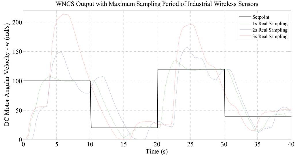 Using the velocity control WNCS first the feasibility of using an industrial wireless sensor for control applications was investigated. It is supposed that the industrial wireless sensor corresponds to the WNCS sensor ECU in Figure 1 and its sampling period is set to 3 s, 2 s and 1 s (which are the maximum possible for these devices).