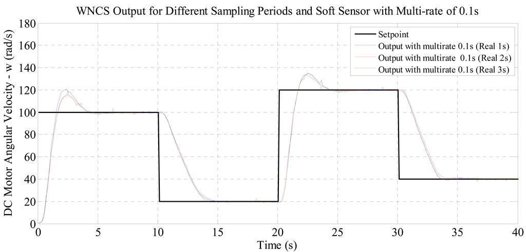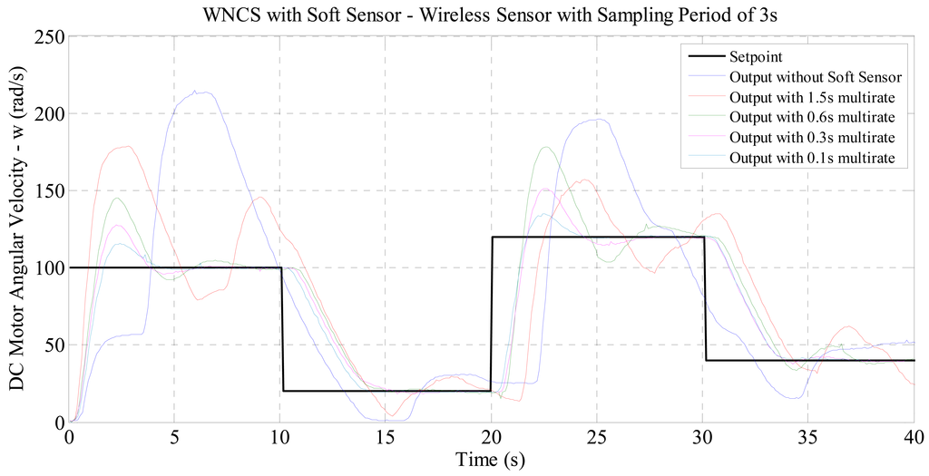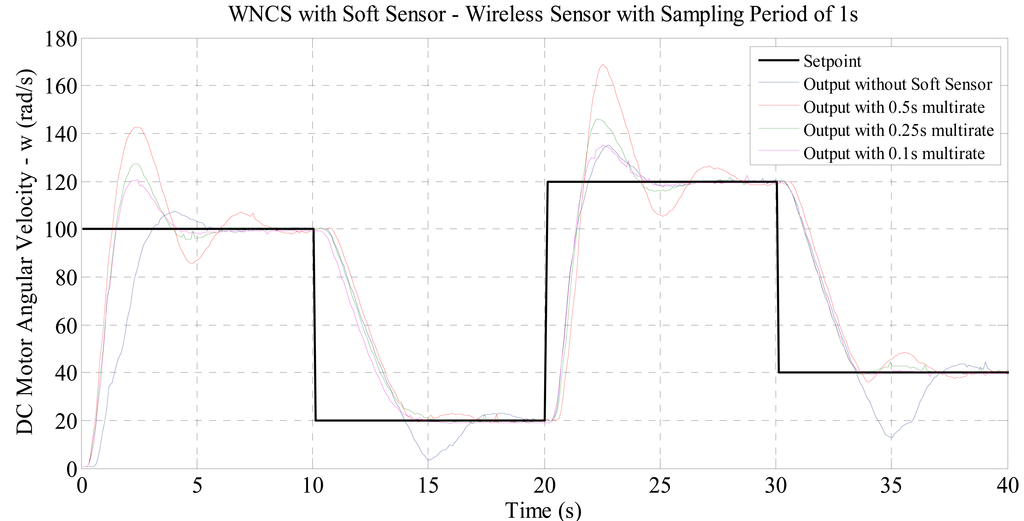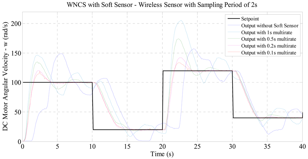 In order to overcome this sampling restriction and enable the use of those wireless sensors in WNCSs, in this paper a soft sensor technique was used with a multi-rate PID controller, allowing actuation on the DC motor N times faster than the sampling of the wireless sensor. With the purpose of validating the application of this soft sensor in WNCS, different experiments were defined. In these experiments, the sampling period of the real wireless sensor was maintained constant (1, 2 or 3 s), while the multi-rate period was changed to increase the amount of data generated by the virtual sensor and used by the controller. Thus it would be possible to evaluate the effects of using the soft sensor on the quality of control of the WNCS.