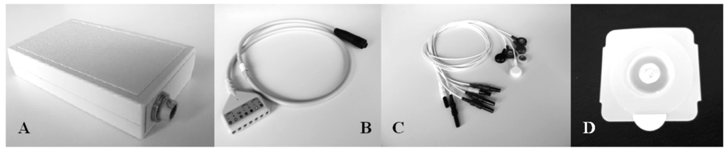 ICG measures the beat-to-beat changes of thoracic bioimpedance via four dual sensors applied on the neck and thorax in order to calculate stroke volume (SV). The experimental set-up consisted of four spot electrodes on the left side of the body (Figure 2B—lateral spot array) [21], a less intrusive configuration than the conventional 8-electrodes or band-electrodes ones [19,20]: