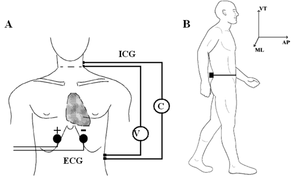 Energy expenditure measurements, such as the physiological cost index (PCI) [17], the total heart beat index (THBI) [18] and the oxygen cost/rate have proven to be a reliable index for quantifying penalties imposed by gait disability [9]. Impedance cardiography (ICG) has been exploited in the last decade as a well established method to provide a non-invasive continuous measure of the stroke volume in resting or mild exercise conditions [19–21].