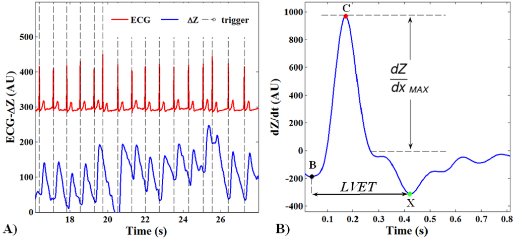 Impedance changes related to heart cycles were separated from the superimposed noise caused by respiration through a synchronous averaging method [27]. The whole ICG signal ΔZ(t) was divided in N subsamples of changeable length depending on the temporal triggers provided by the R-peaks of the ECG signal (Figure 3A). The out coming N subsamples were summed and averaged.